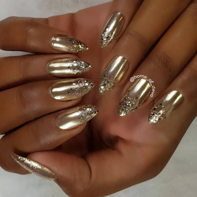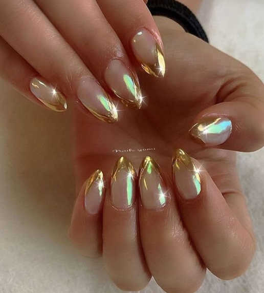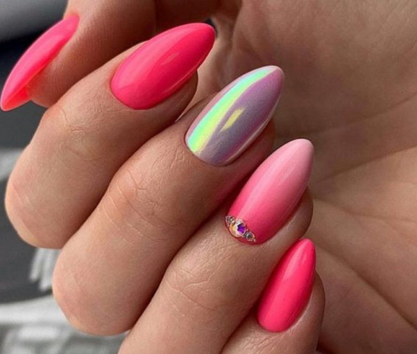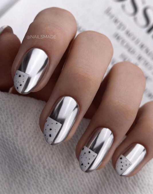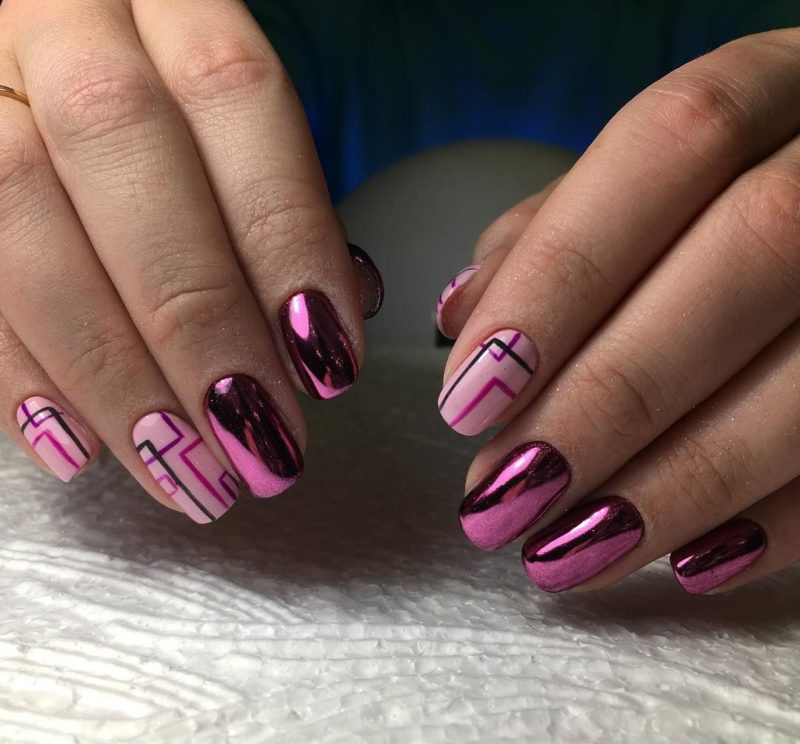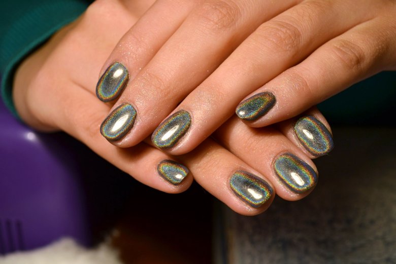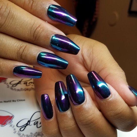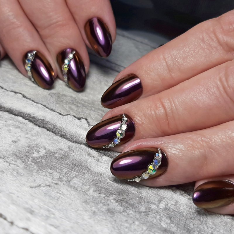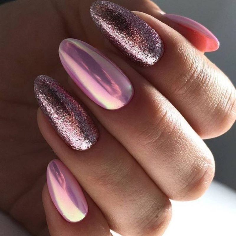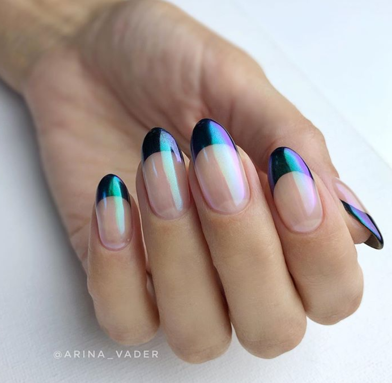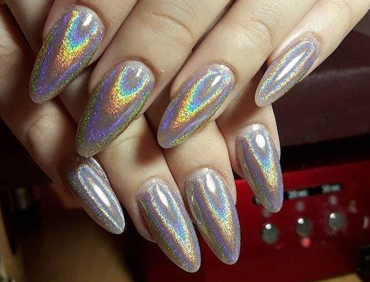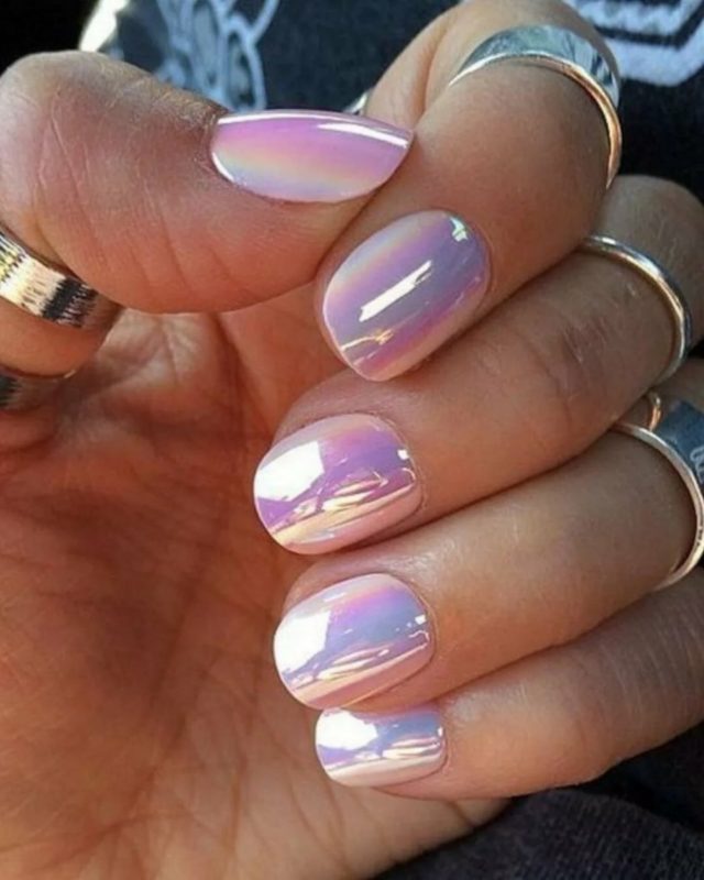 С помощью зеркального блеска мастер может скорректировать длину ногтя. Конечно, визуально. Если хотите большую длину, придется нарастить пластину. Короткая длина несколько ограничивает использование пигментов. Например, зеркальная, жемчужная и хамелеон подойдут таким ноготкам. А вот для призмы длины может не хватить. Просто не получится добиться желаемого эффекта в маникюре.