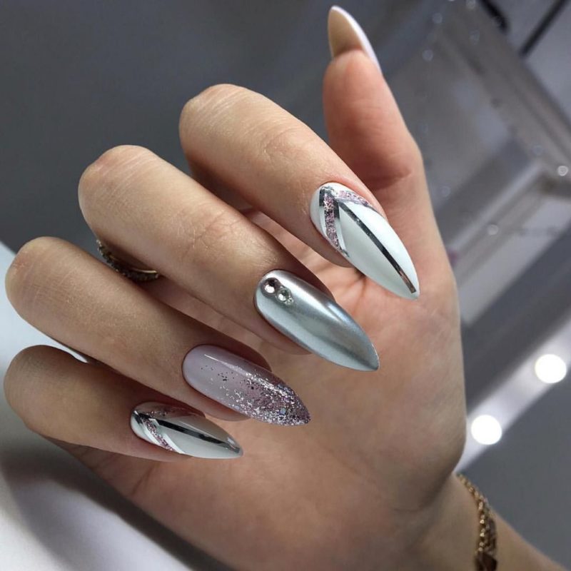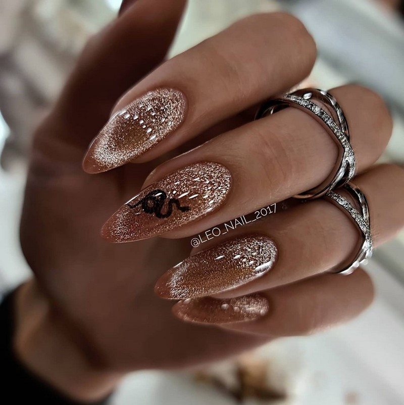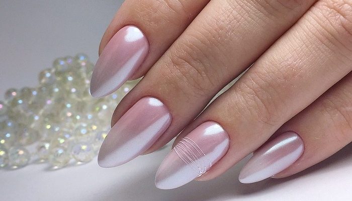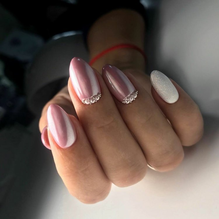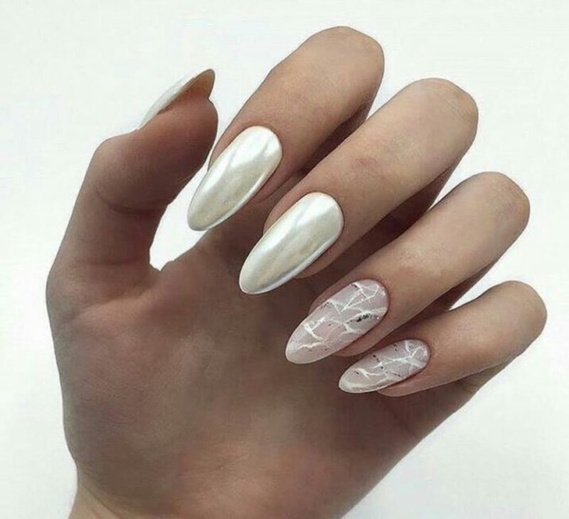 Миндальная форма просто создана для втирки — жемчужный эффект в свадебном маникюре просто незаменим. Не менее интересно смотрится и диагональная полоска кошачьего глаза на овальной форме. Если длина позволяет ноготки украшают дополнительным дизайном.