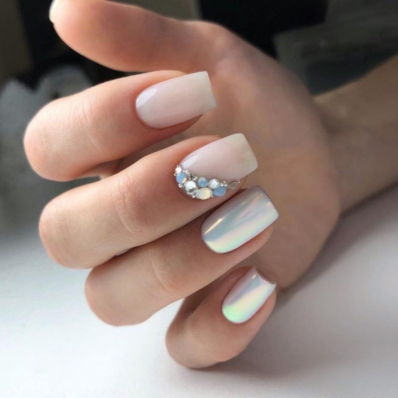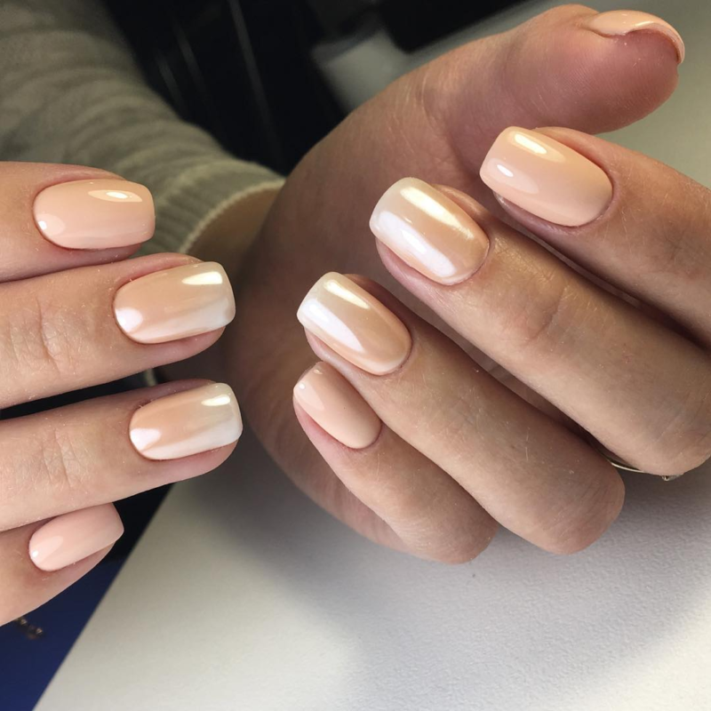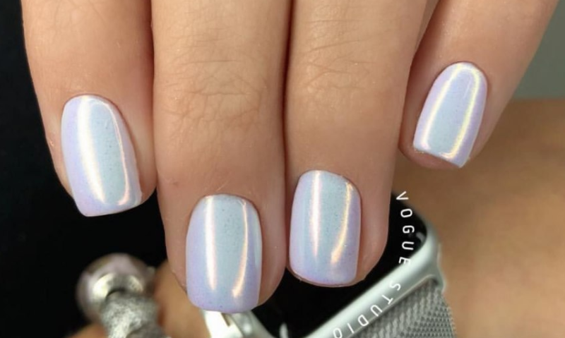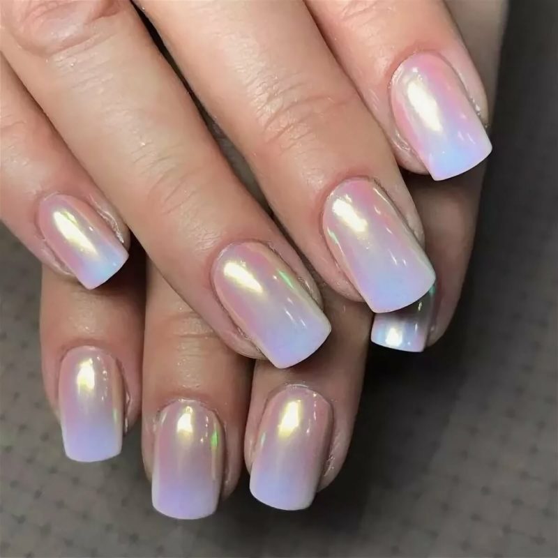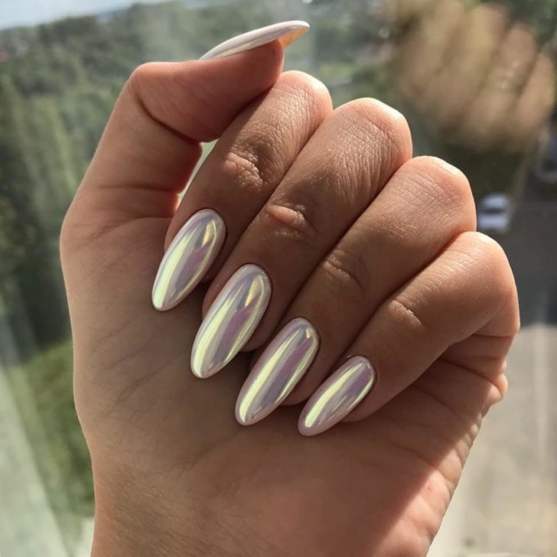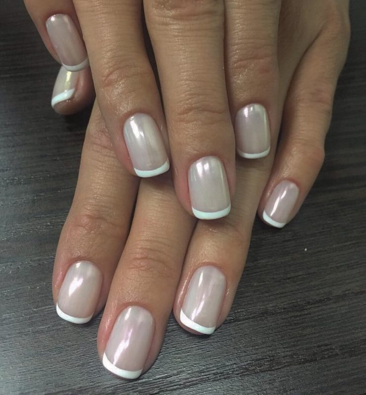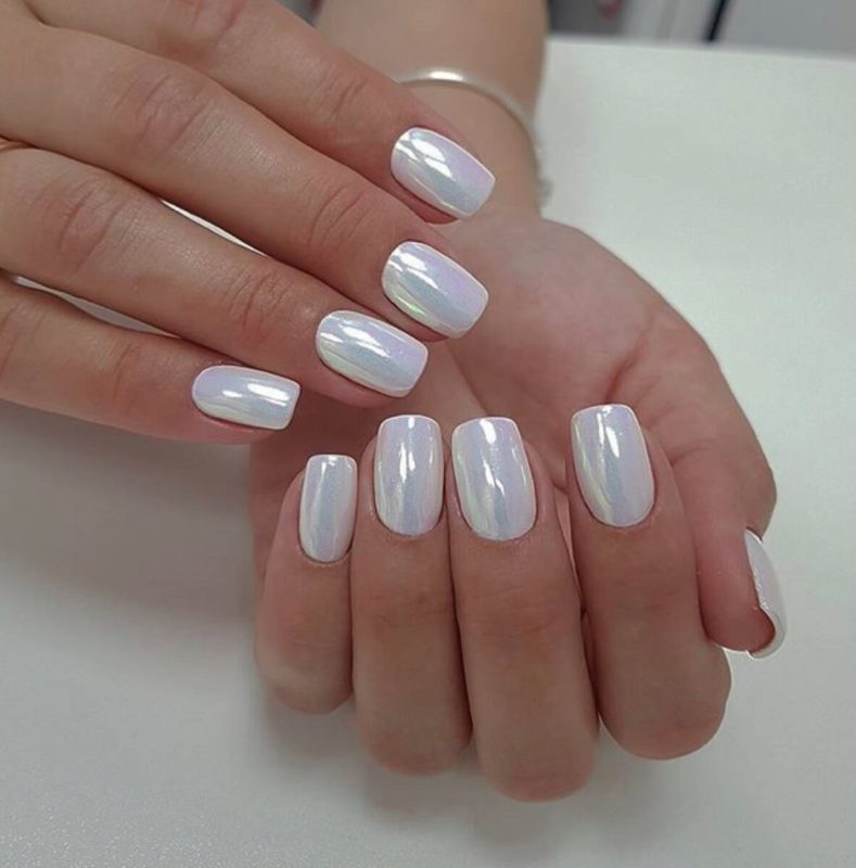 Отличный вариант для свадебного маникюра. Это простой пигмент, который делает любую поверхность перламутровой или жемчужной — все зависит от нанесенной подложки. Идеальный дизайн — простая белая база, френч с прозрачной основой и белым кончиком, нюдовый моно маникюр.