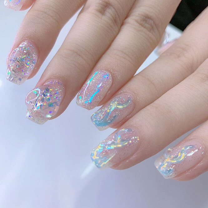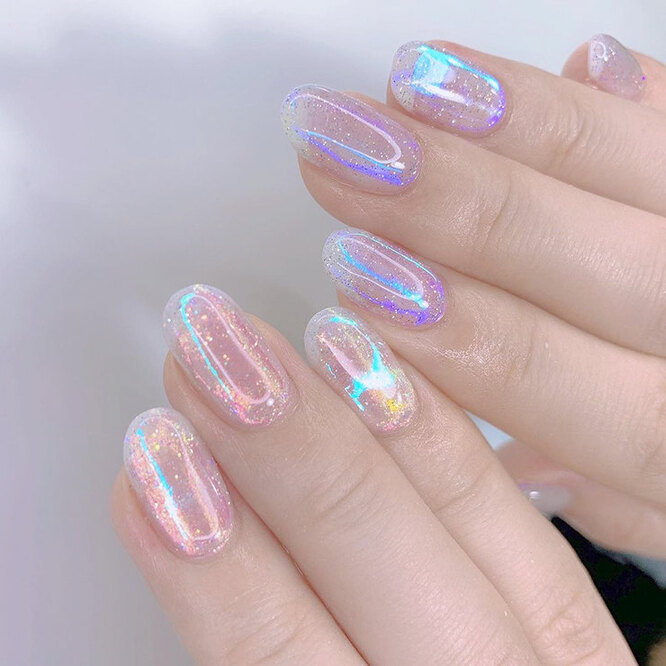 Полупрозрачный пигмент, добавляющий ноготкам сверкающие оттенки розового, голубого, бирюзового и иных пастельных цветов.
