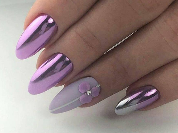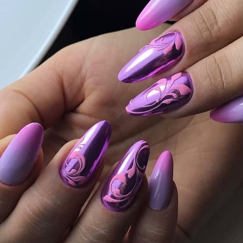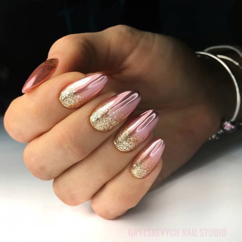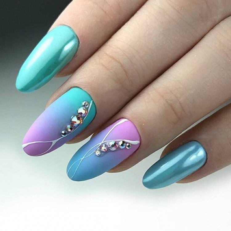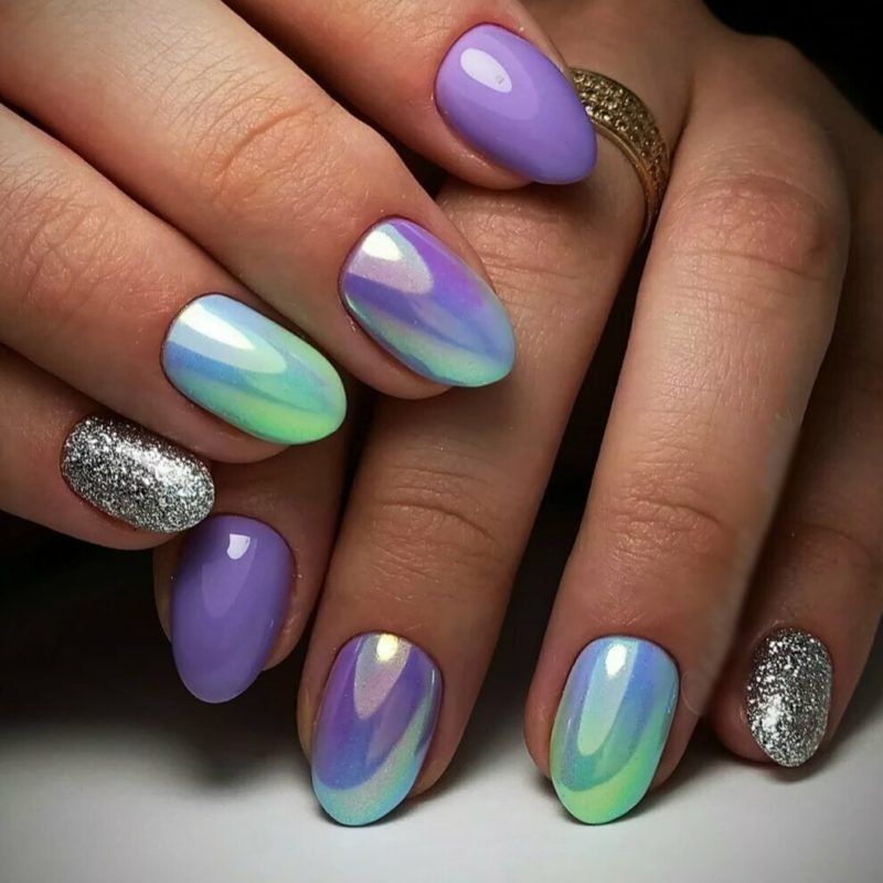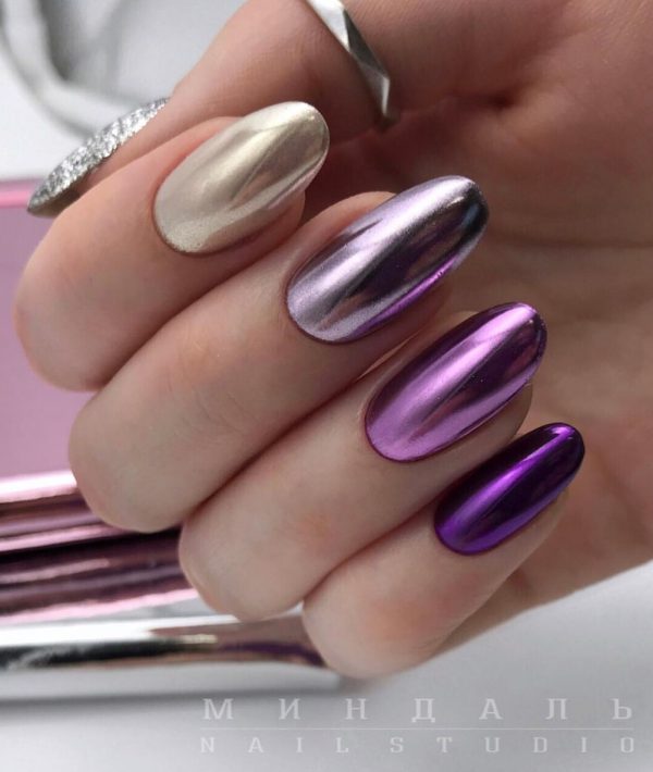 Градиент или омбре — классический вариант дизайна, к которому не теряют интереса модницы уже много лет. Если дополнить такую растяжку цвета ярким зеркальным блеском — получите интересный и необычный дизайн.