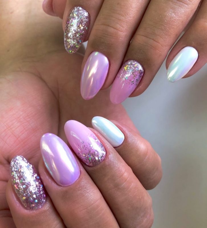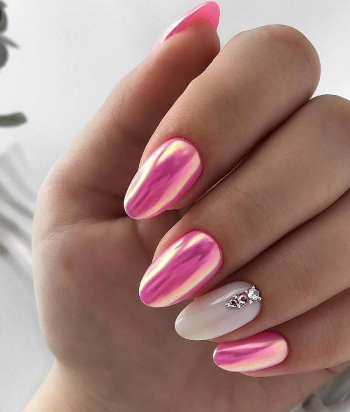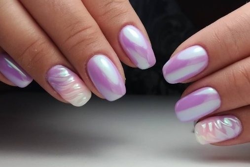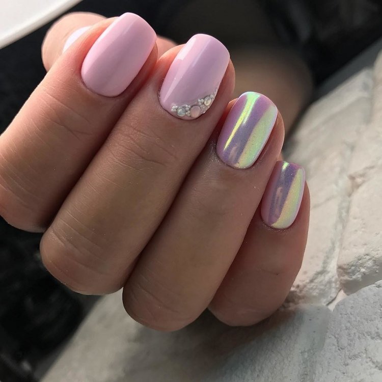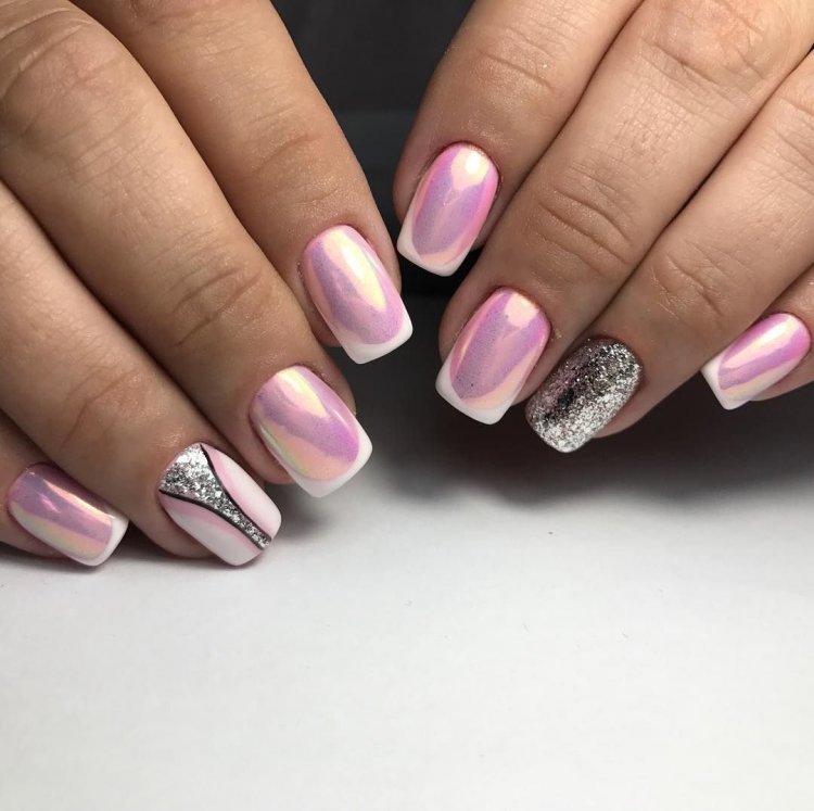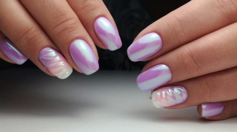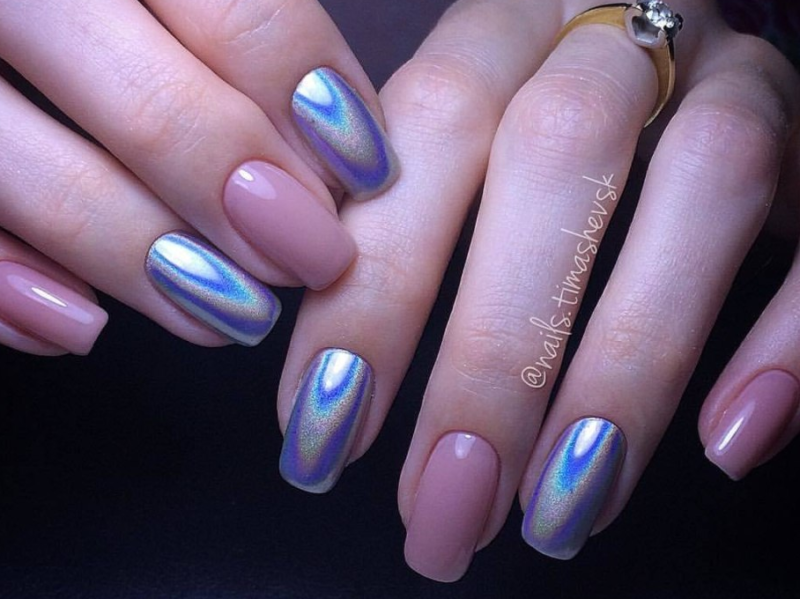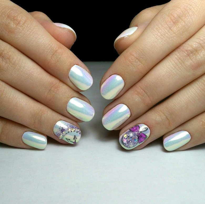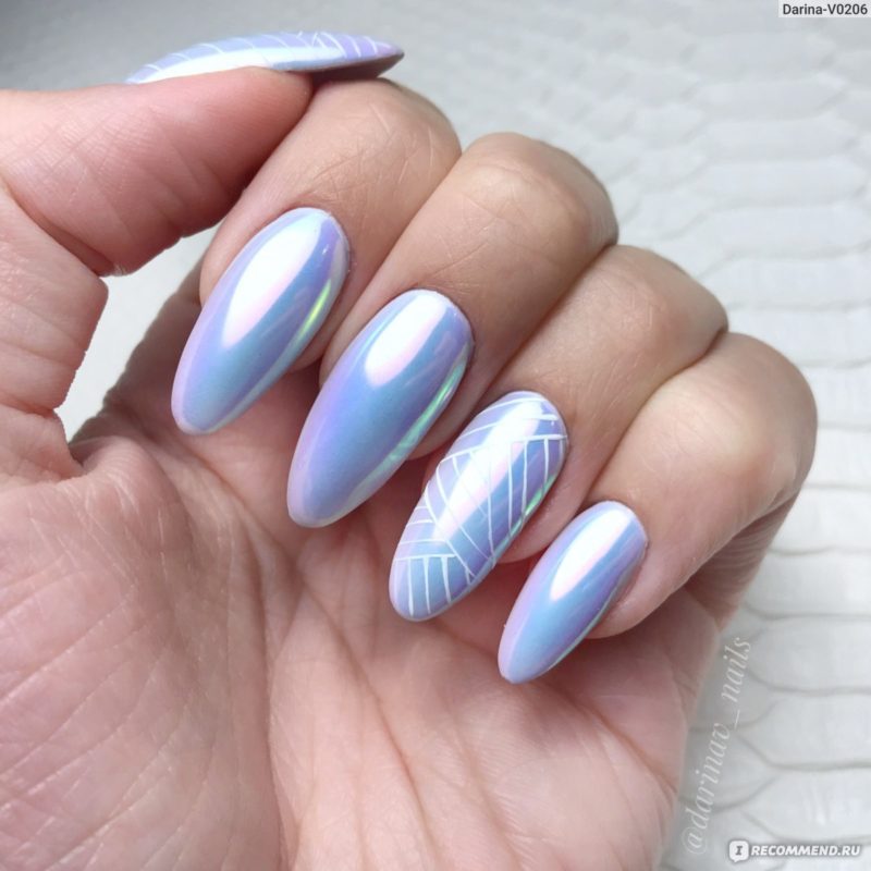 Эффектнее всего такая втирка смотрится на нюдовой, розовой или белой базе. Но если вы решите нанести пигмент на любую другую подложку, ногти будет выглядеть не менее сказочно. А если дополнить маникюр дизайном, то и очень стильно.