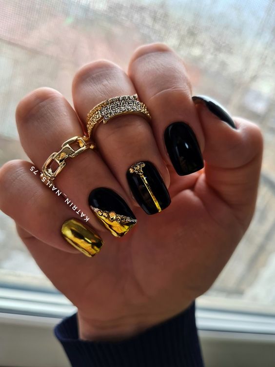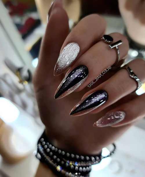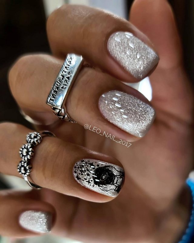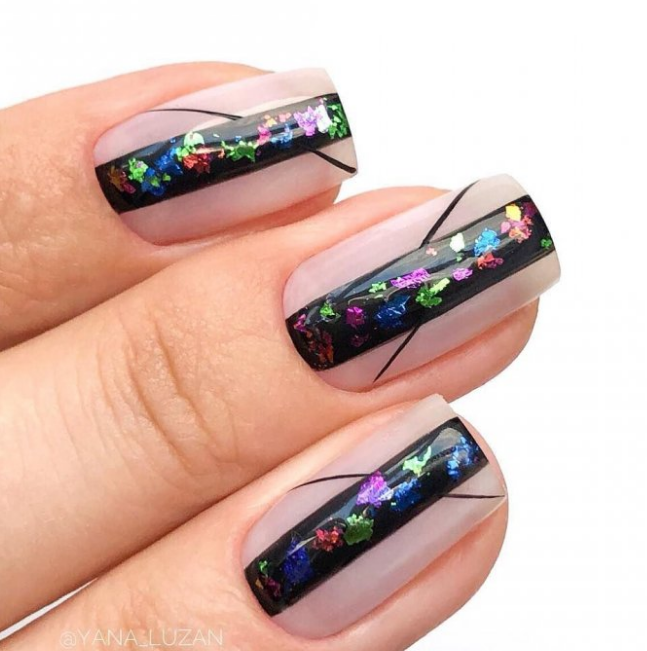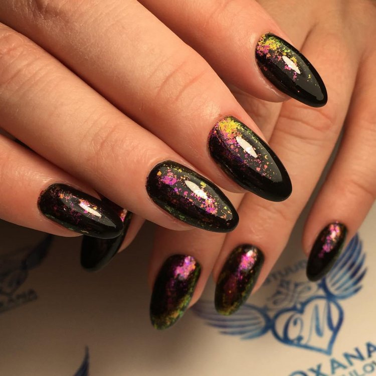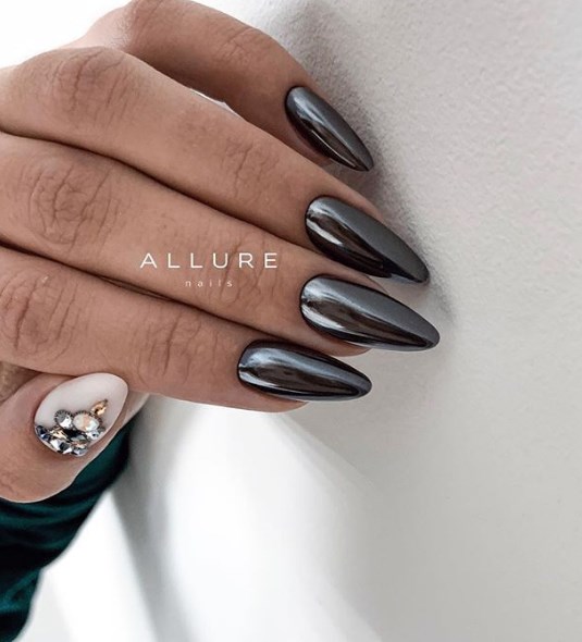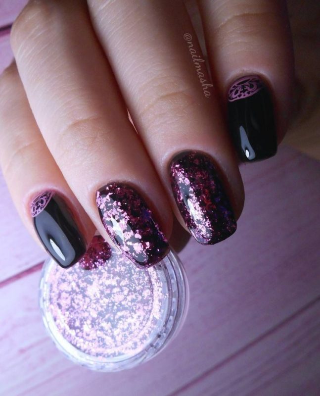 Темная база — самый лучший вариант для декорирования пудрой. Монохром делает ее эффект глубоким и загадочным. Для дополнительного дизайна стоит использовать рисунки, стразы, наклейки.