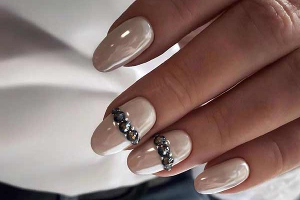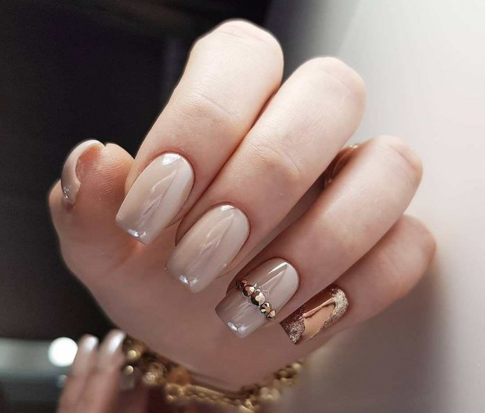 Те, кто выбирает нюдовые оттенки лака, как правило, любят минимализм. Если не хочется наносить наклейки, лепить стразы и декорировать пластину рисунками — выбирайте втирку. Достаточно покрыть жемчужным составом пару пластин и вот уже дизайн становится необычным и стильным.