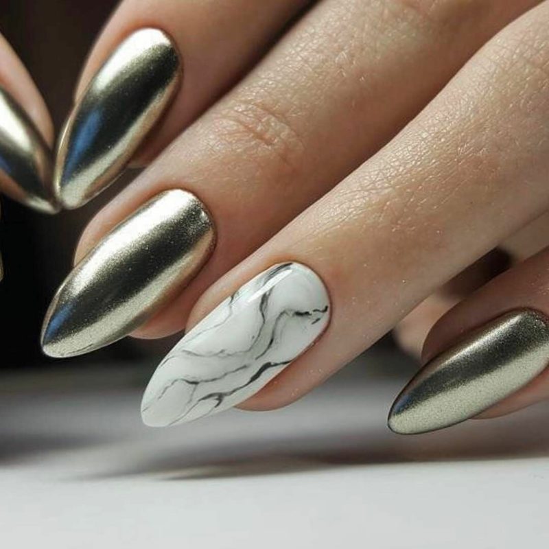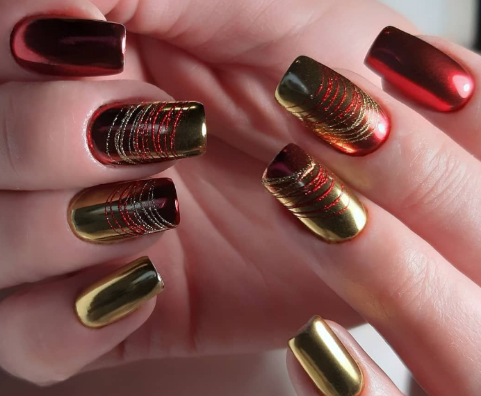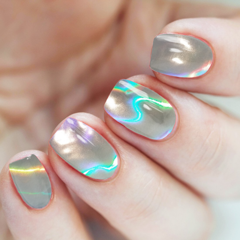 Мелкая полимерная пыль выглядит как металлическая стружка, которую перемолоть в кофемолке. Интересно, что после нанесения она создает на пластине зеркальное покрытие. В нем можно увидеть свое отражение. Серебристая или золотая втирка создает впечатление, что ноготь покрыли расплавленным металлом и отполировали.