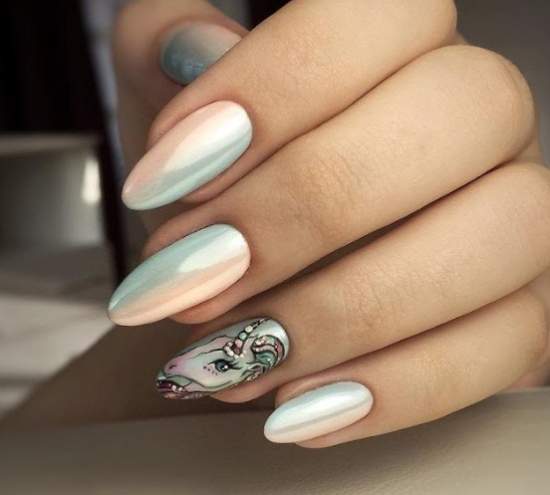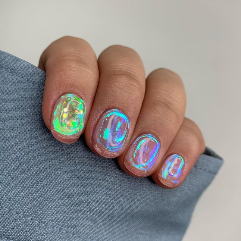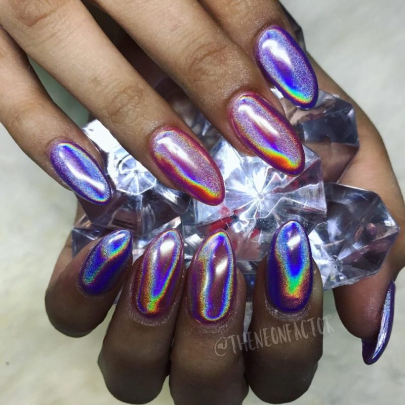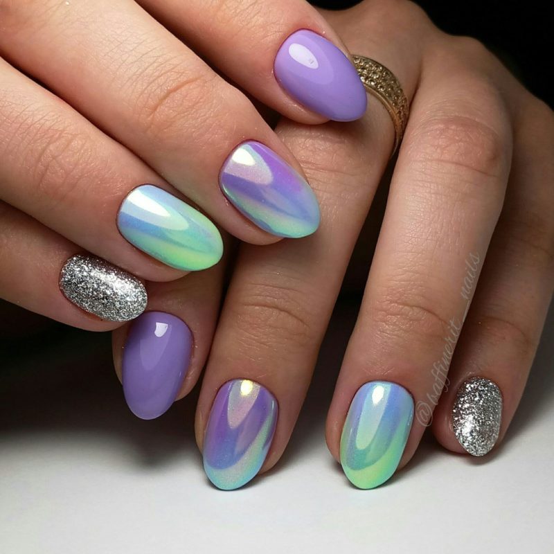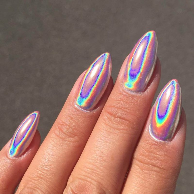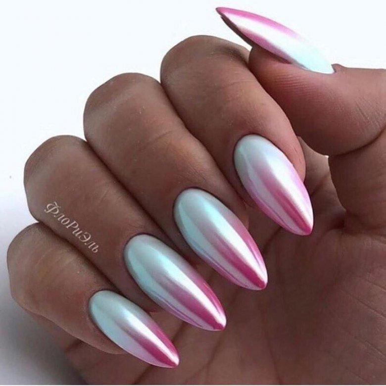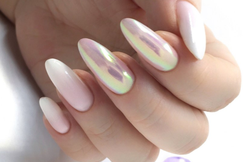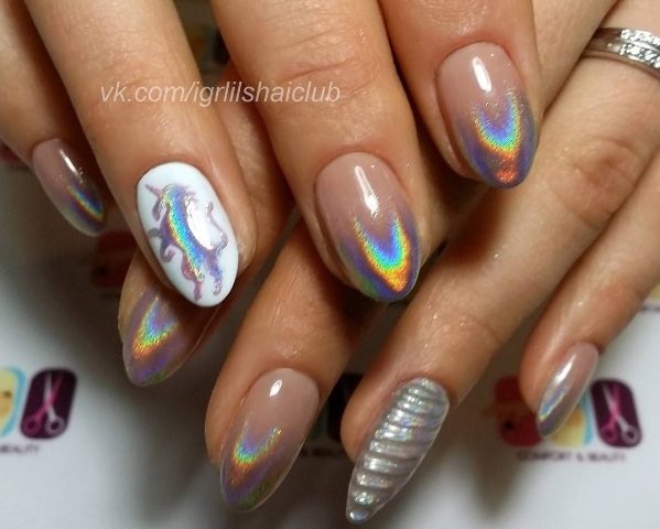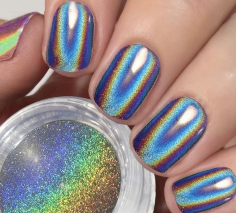Этот вид пигмента не просто так получил название мифического животного. Тот эффект, который создает в маникюре втирка единорог сродни магии. Все, на что она наносится, покрывается необычным переливающимся светом. В основе этого пигмента лежит смесь из ранее известных — жемчужного, голографической, северного сияния.