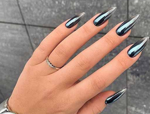 Вариант пудры, которая втирается в пластину без липкого топа. Результат — зеркальные переливы с переходами оттенков. Особенно эффектно такой дизайн смотрится на темной базе. Эффектно на такой зеркальной поверхности смотрится и капельный дизайн.