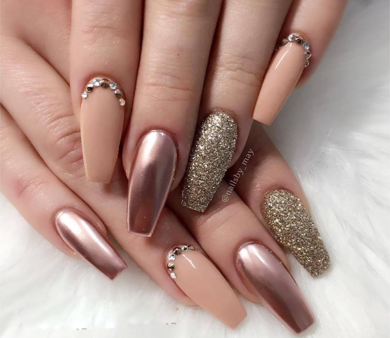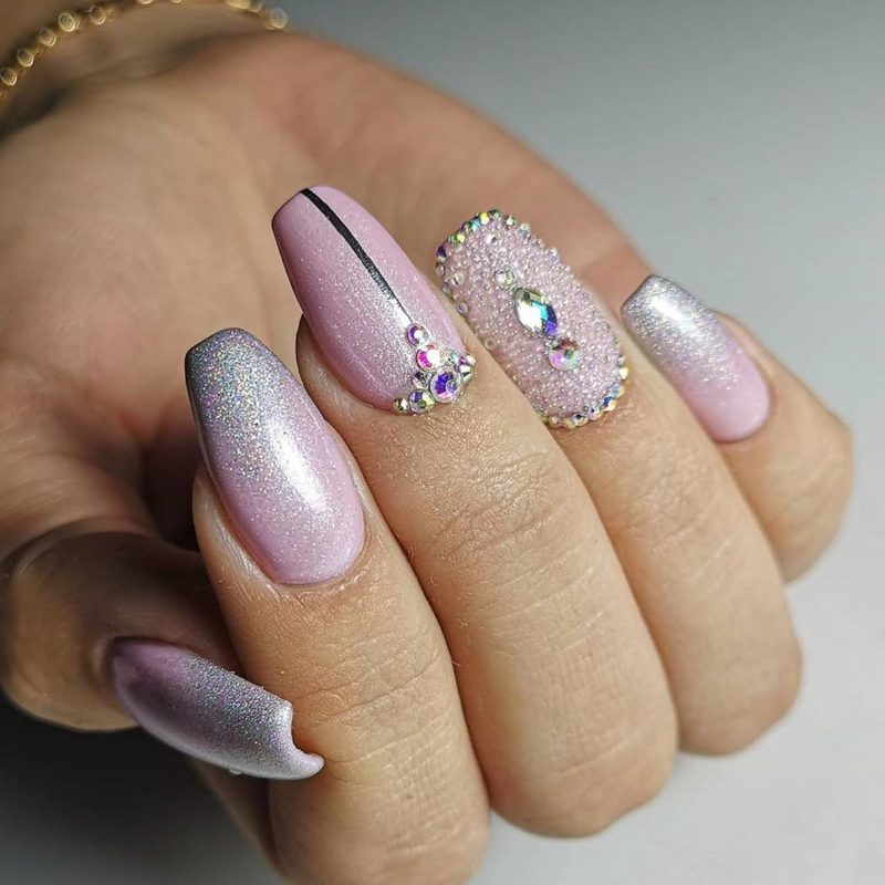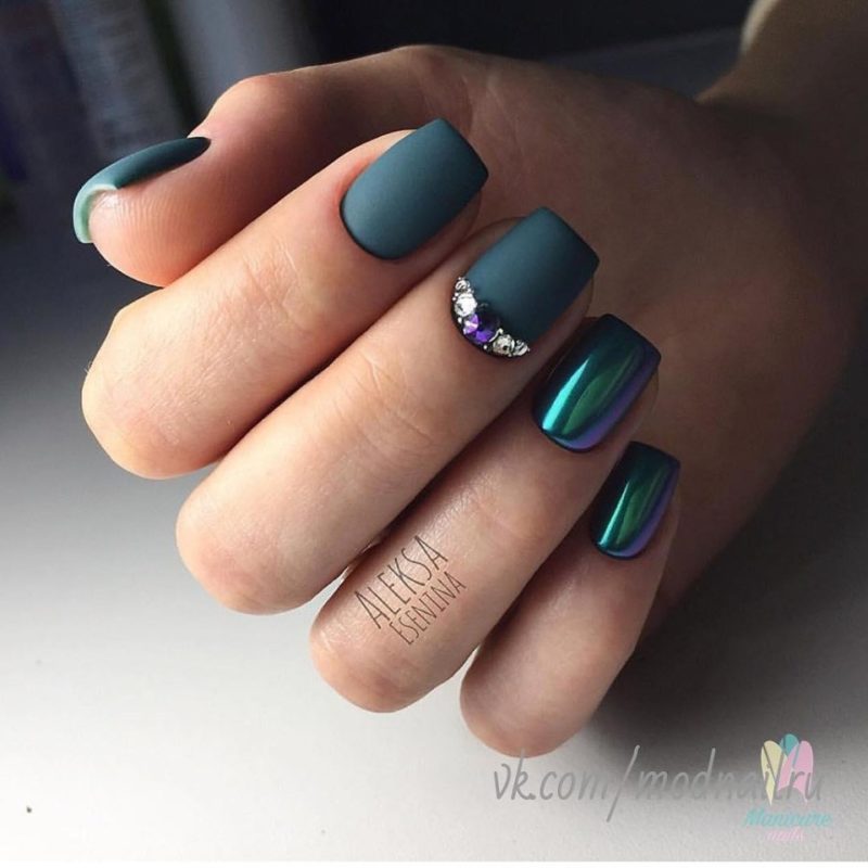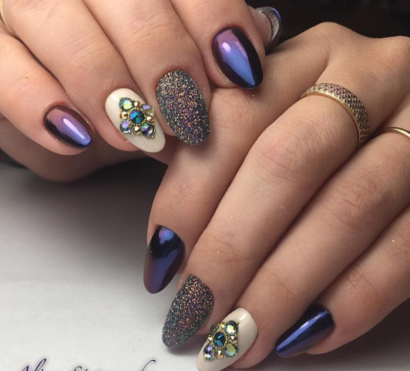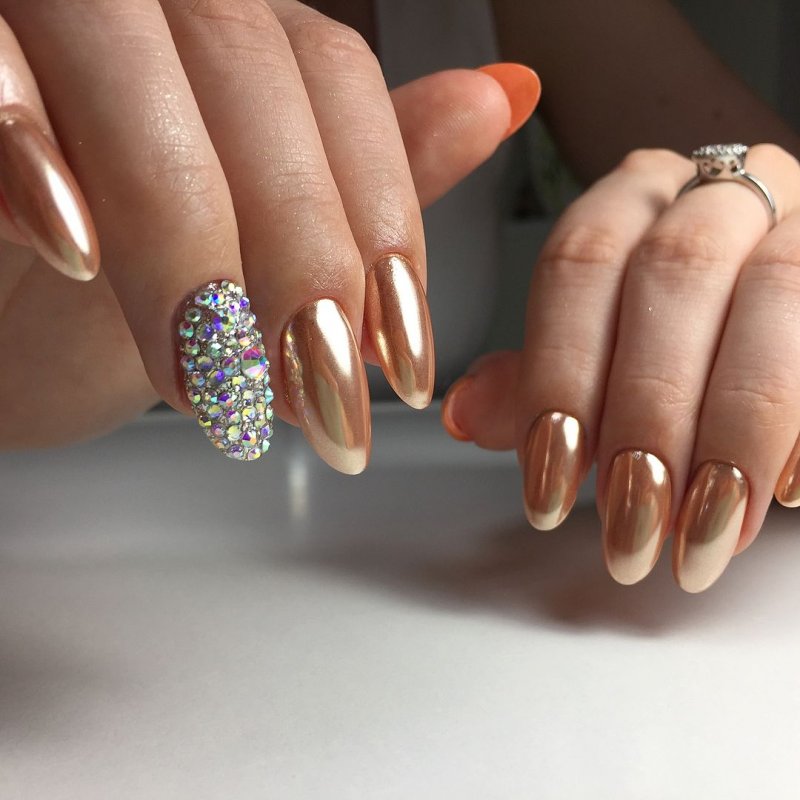 Думаете блестящий пигмент и стразы несовместимы? Это не так. Небольшие камни только украсят маникюр. Покрыть ими можно пластину, которая уже покрыта блеском или выделить таким образом соседние ноготки. Например те, которые покрыты матовым топом.
