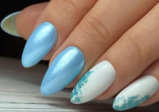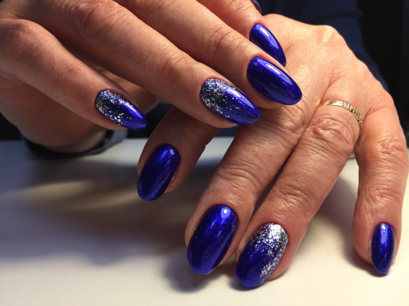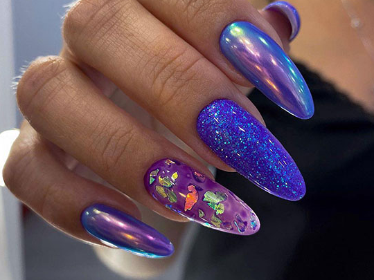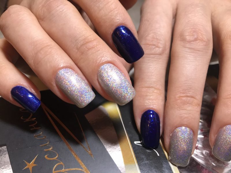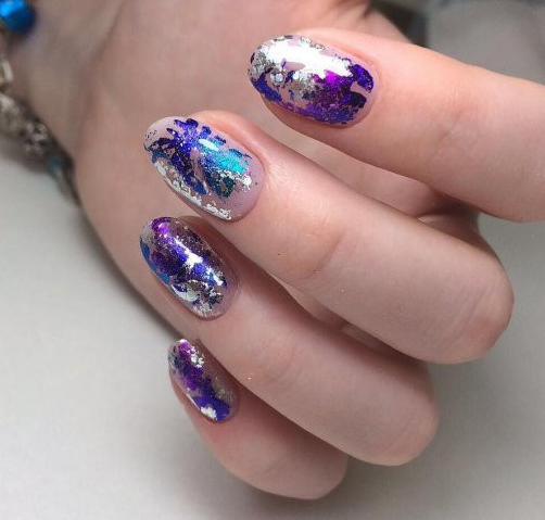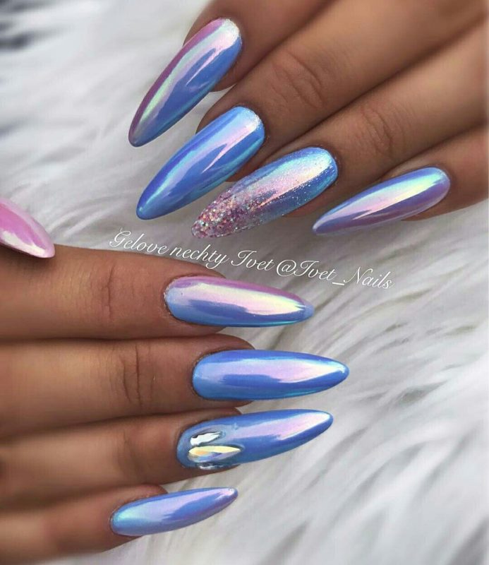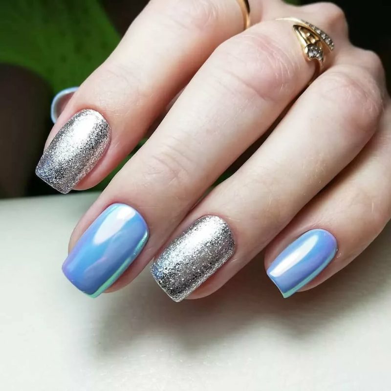 Оттенки синего всегда смотрятся красиво на ногтях любой формы и длины. Это беспроигрышный вариант для повседневного образа, в котором часто присутствуют джинсы. Разнообразить маникюр можно с помощью голографического эффекта.