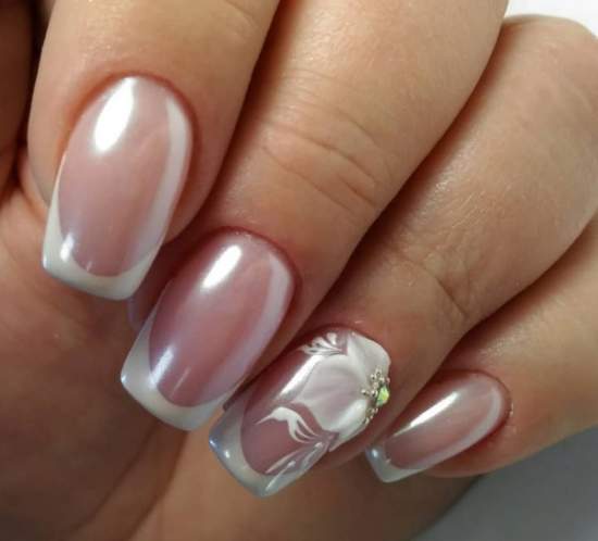 Сочетание современного нейл арта и классического френча — красиво, можно и актуально. С помощью пудры можно выделить улыбку французского маникюра. Или просто выделить один ноготь на руке, а остальные оформить в классическом стиле.
