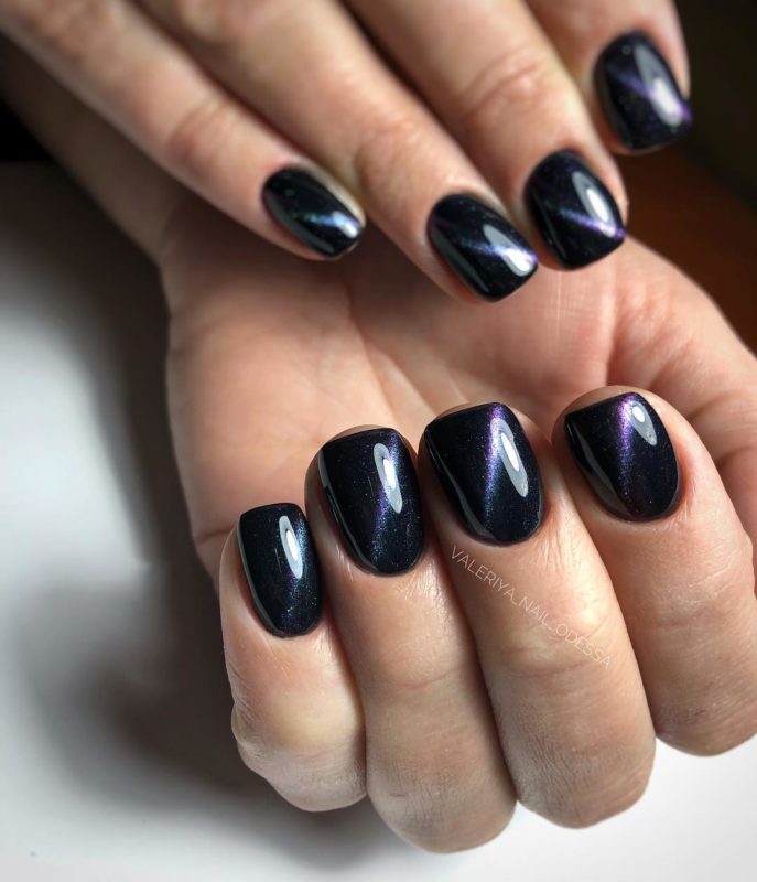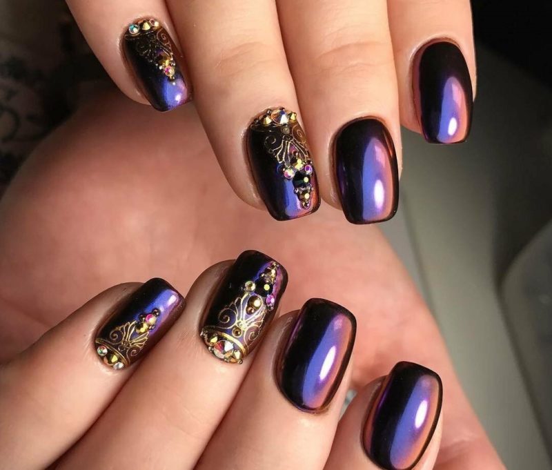 Квадратная форма более требовательна к выбору как вида втирки, так и дизайна. Здесь уместен зеркальный или металлический блеск, призма и хамелеон. Квадратные ногти с блеском отлично смотрятся в темном варианте.