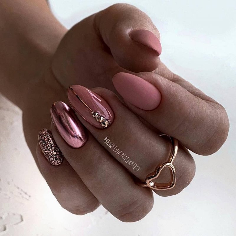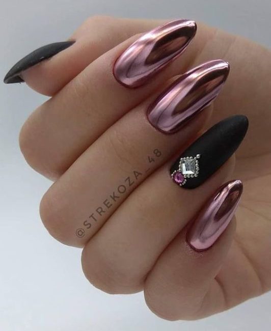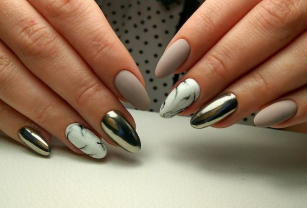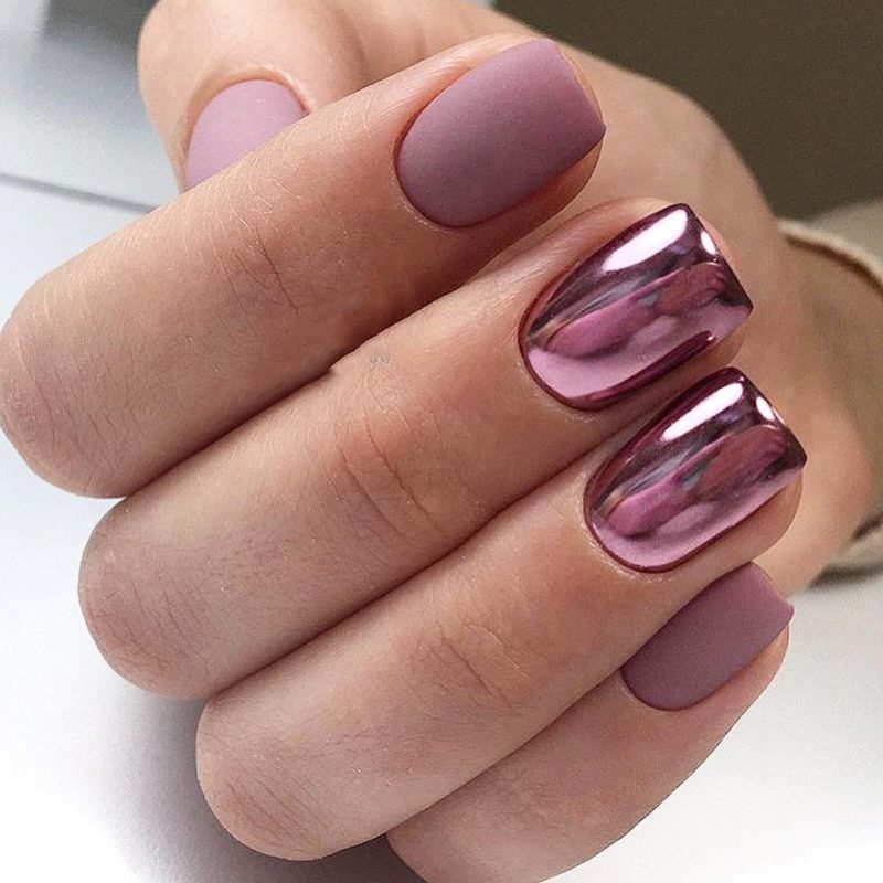 Маникюр в стиле разные руки давно перестал поражать своей смелостью. Пора внести в него новые нотки — оформите одну руку матовым топом, а вторую втиркой. Это будет смело, необычно, а руки действительно будут украшены по-разному.