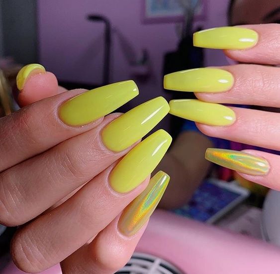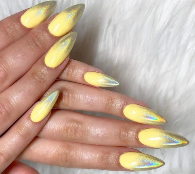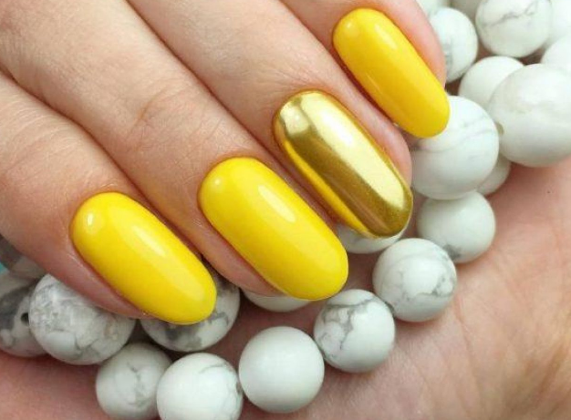 Желтый гель лак, как правило, используется в качестве акцента в маникюре. Если вы оформили в этот оттенок один или два ноготка на руке, просто дополните дизайн порцией зеркального блеска. Остальные пальчики можно оформить в коричнево-бежевой гамме. так получится сделать эффектный осенний маникюр.