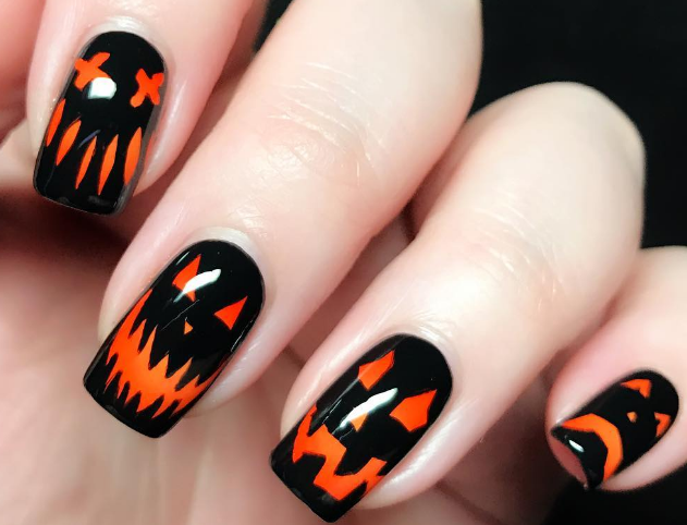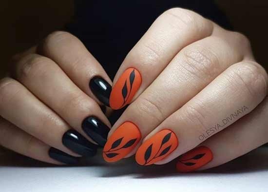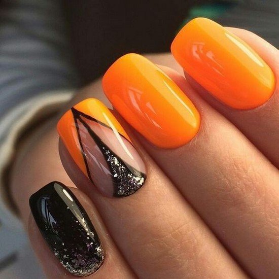 Для контрастных рисунков, интересных сочетаний, праздничного маникюра используется черный цвет. С его помощью получится создать четкую геометрию, анималистический принт. Ну и, конечно, какой дизайн для Хэллоуина без черно-оранжевого сочетания.