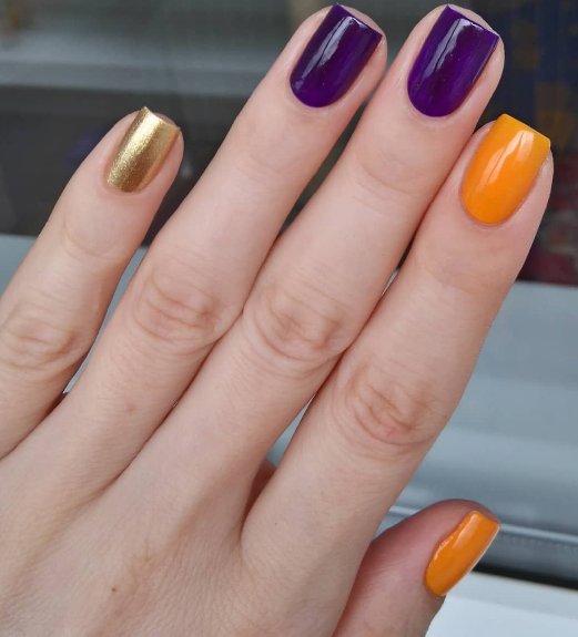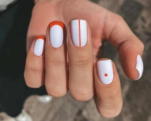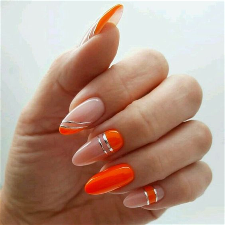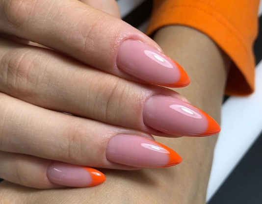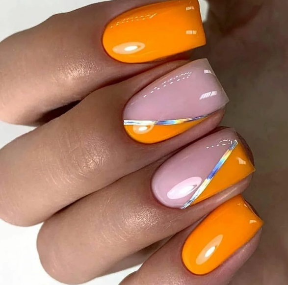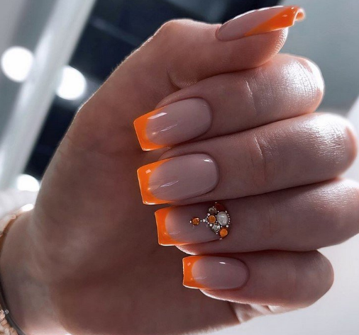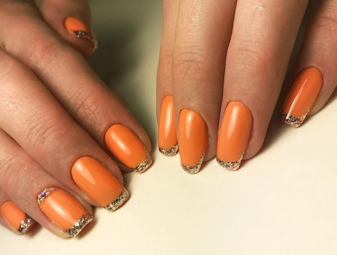 Обратите внимание на дизайн френч, в котором полоска будет не традиционной белой, а оранжевой. Или лунный с контрастным выделением горчичным, оранжевым золотом, медным.