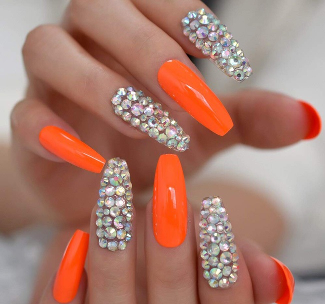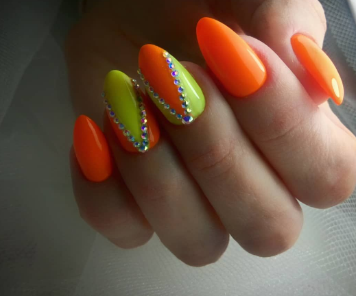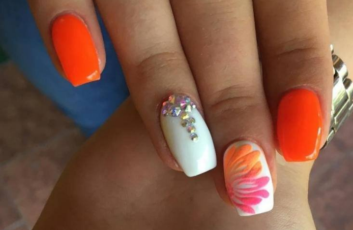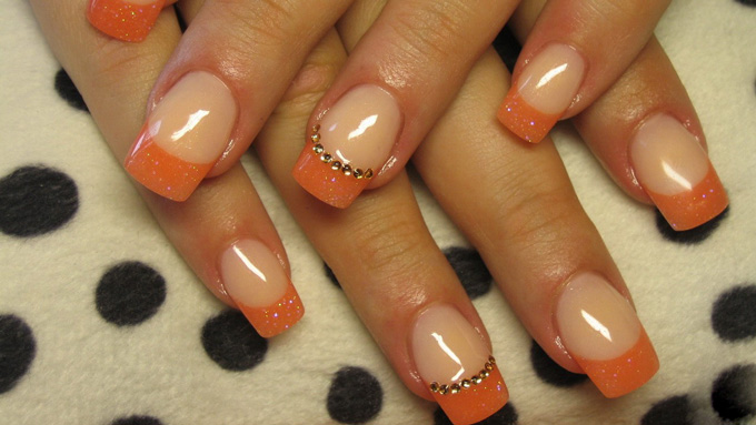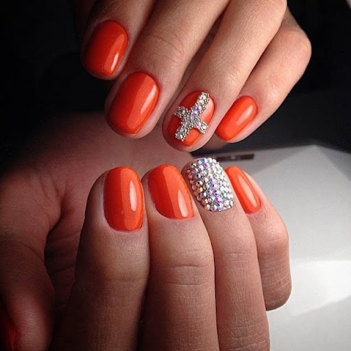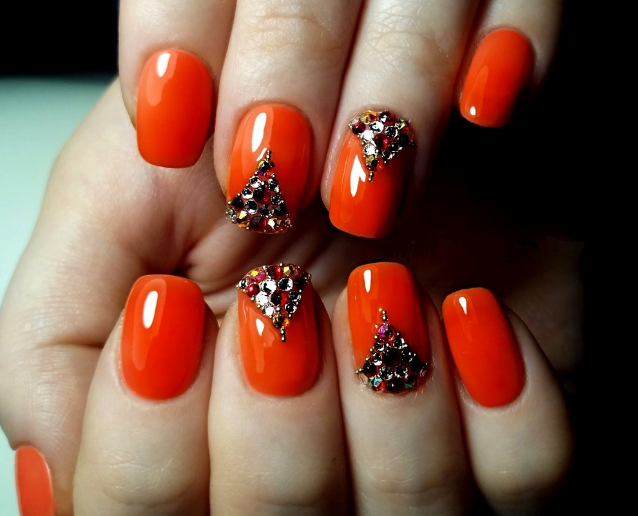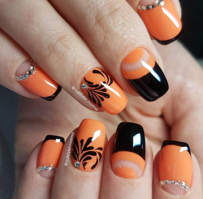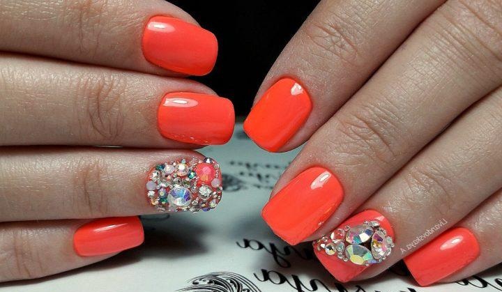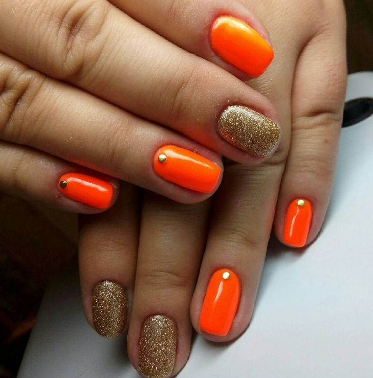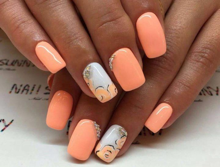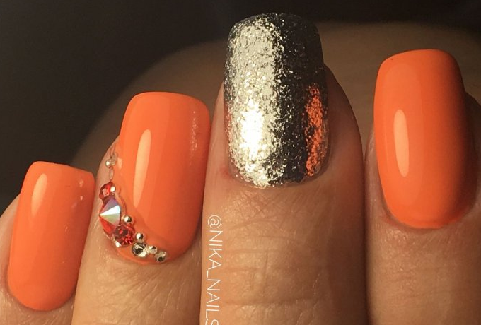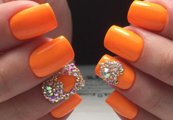 Дизайн коротких ногтей в апельсиновом цвете практически не имеет ограничений. здесь действуют общие правила нейл-дизайна — короткую пластину не стоит перегружать декором, размещать его близко к краю. Например, тяжелые стразы большого диаметра “украдут” пространство и могут привести к поломке пластины.
