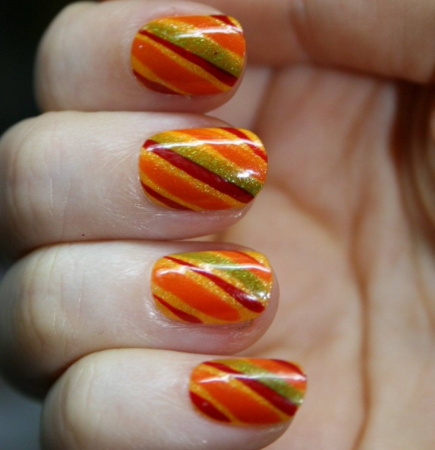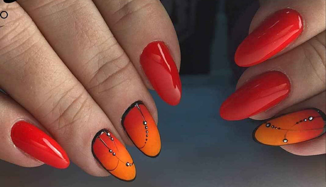 “Горячее сочетание” цветов. С его помощью получится создать осенний дизайн, отражающий все краски позднего сезона. Красивым получится маникюр со стемпингом, градиентом, акварелью, negative space или блестками.