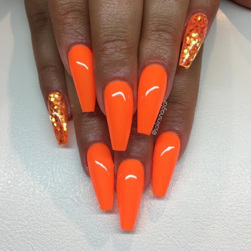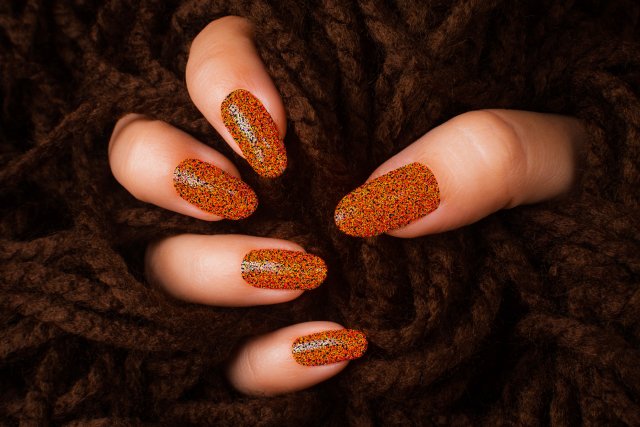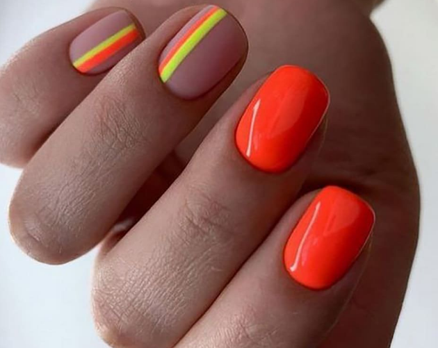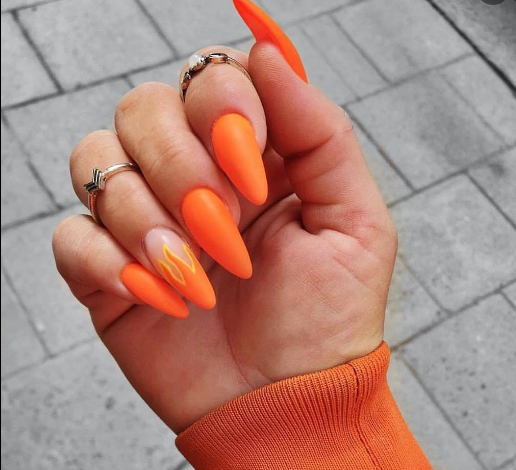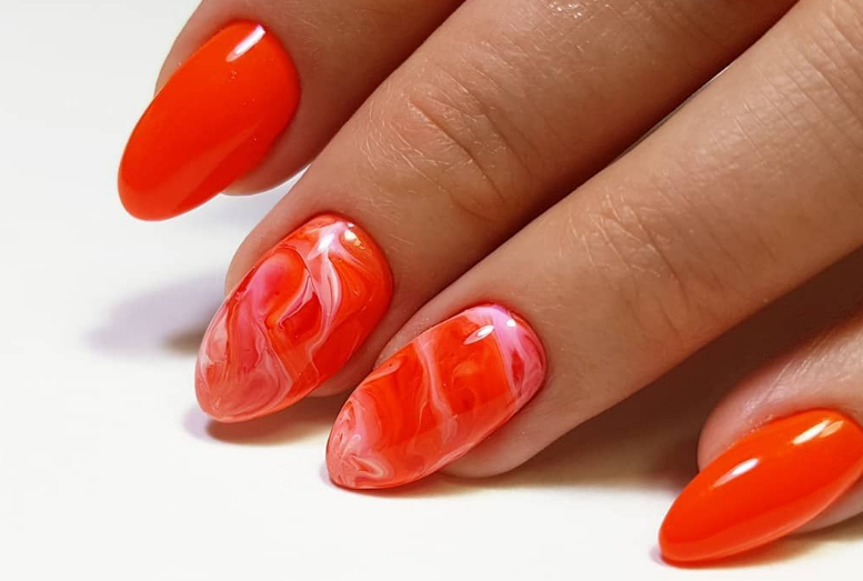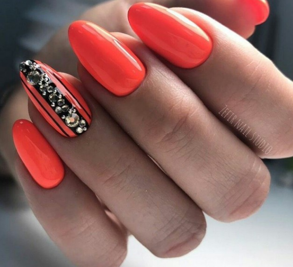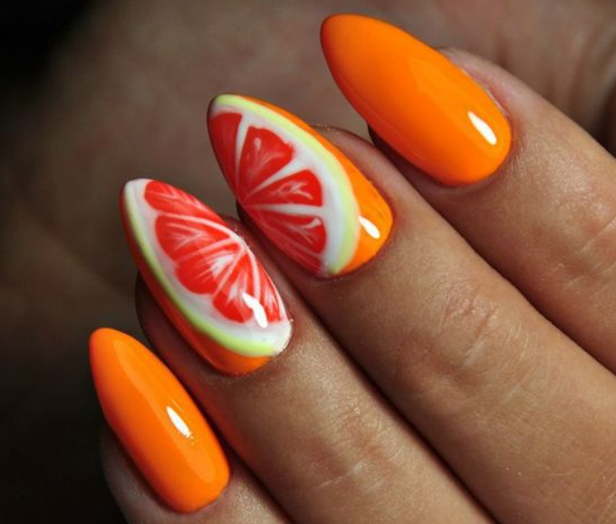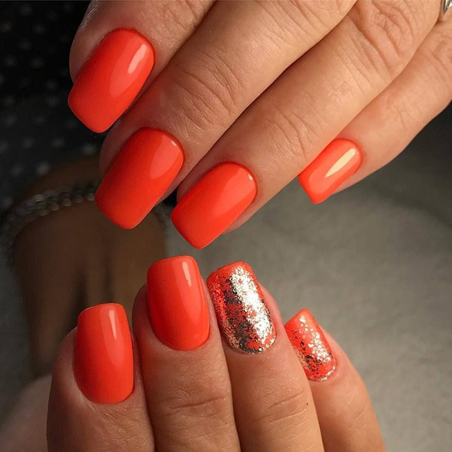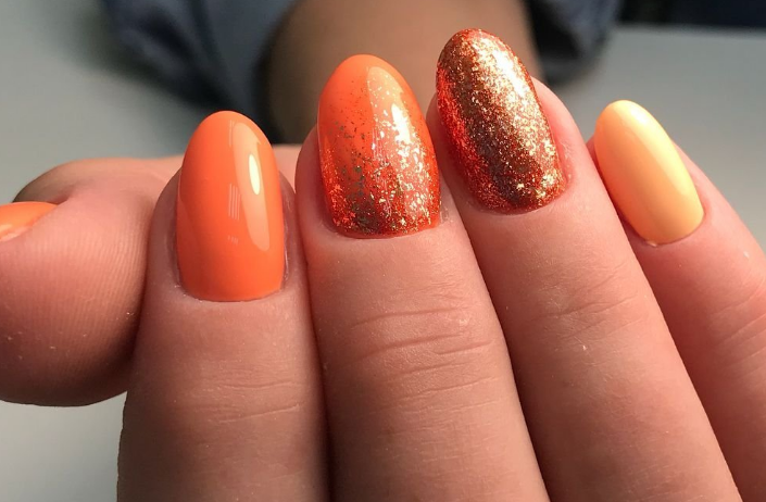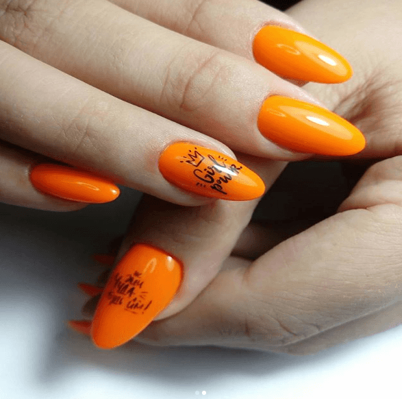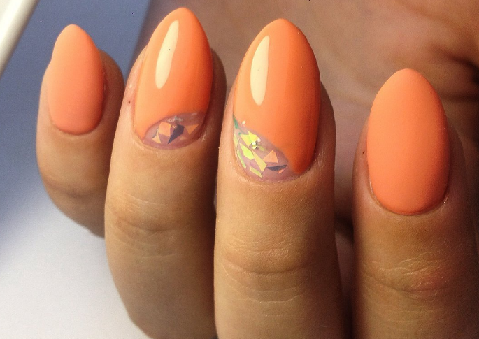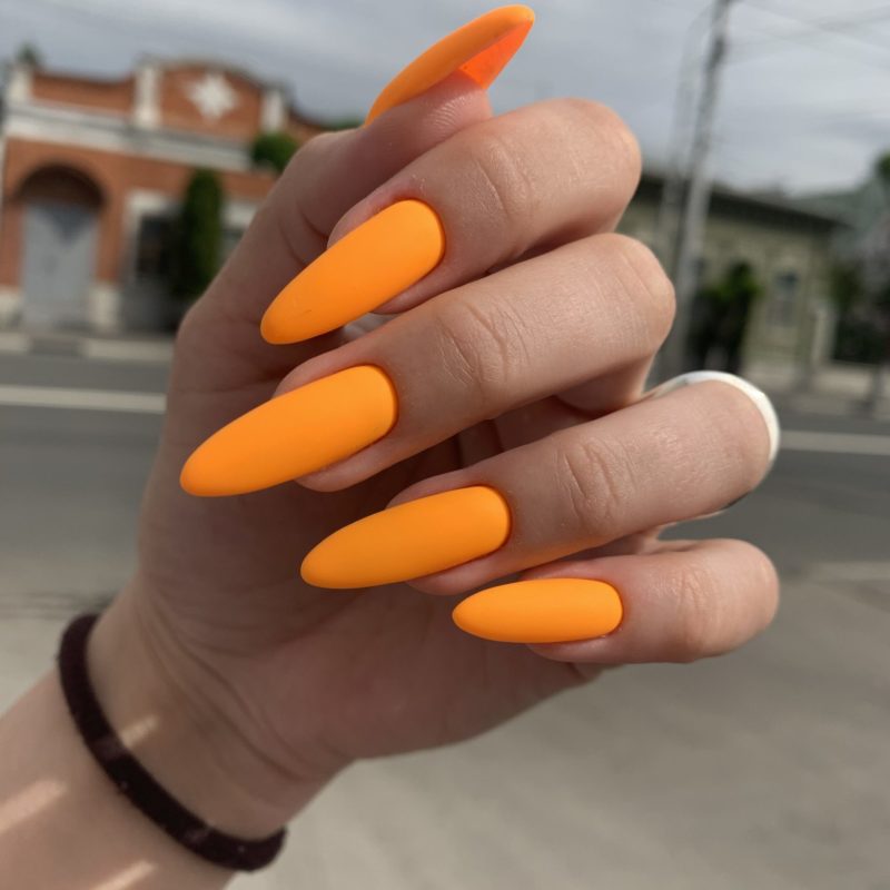 Оранжевый маникюр универсален — он идет любой длине и форме. С его помощью можно визуально скорректировать длину.