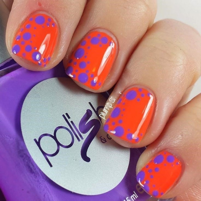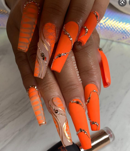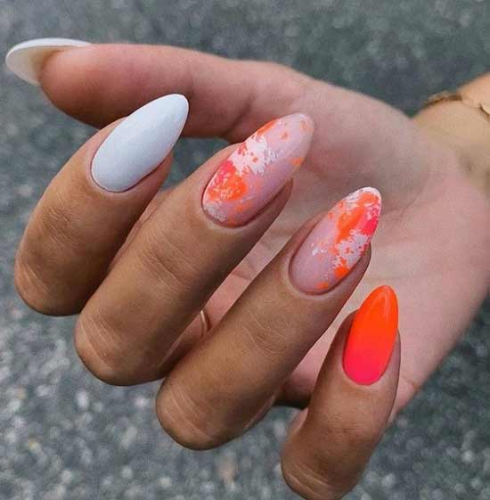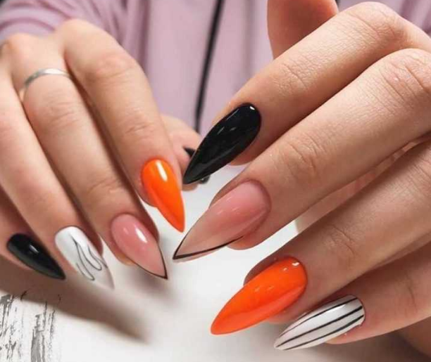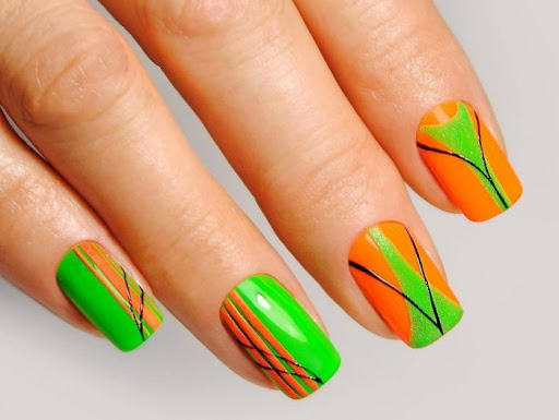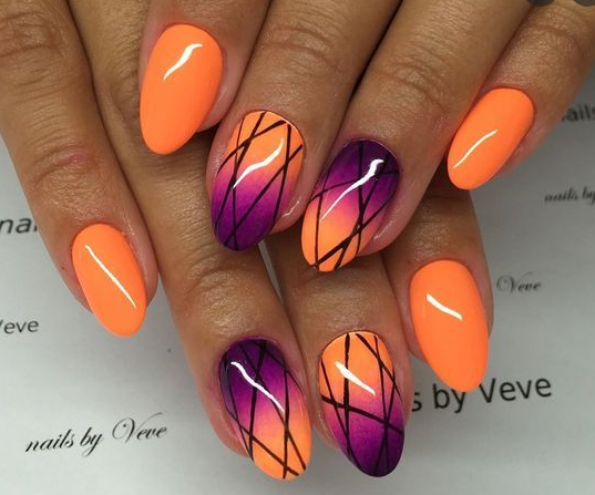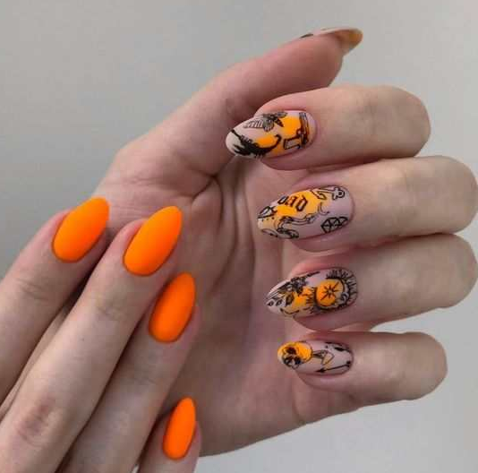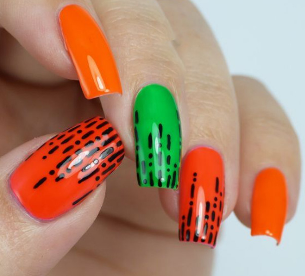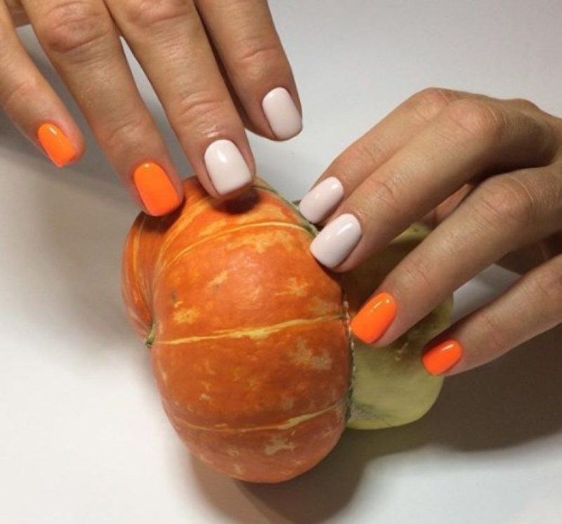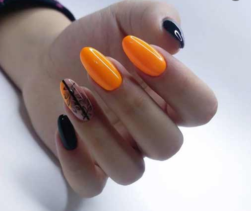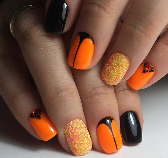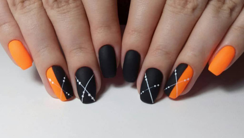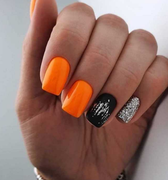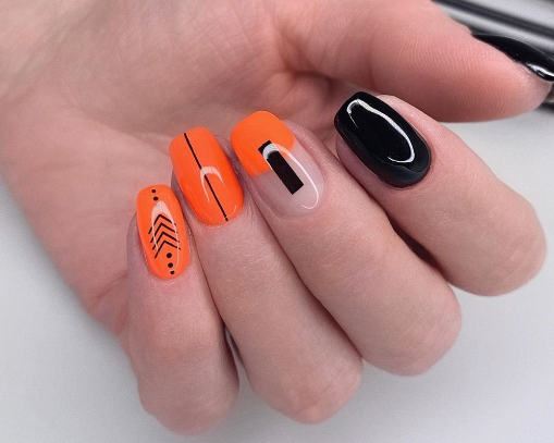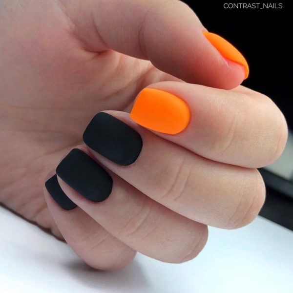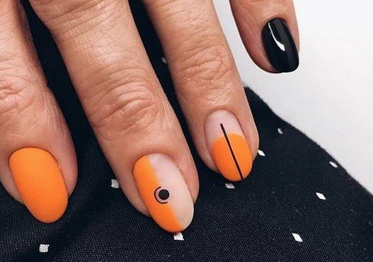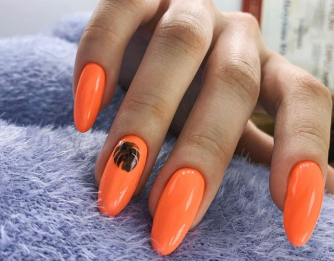 Обязательно сочетайте яркий тон с контрастным. Ярко-оранжевый — обязательный атрибут праздничного дизайна ногтей — на Хэллоуин, Новый год или обычную дискотеку. В последнем случае допустимо сделать неоновый моно-дизайн.