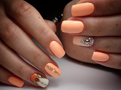 Размытый, приглушенный оттенок апельсинового цвета в дизайне ногтей предпочитают те, кто хочет сделать повседневный маникюр. Ногти в таком цвете выглядят ухоженно, особенно, если будет выбран матовое покрытие. Бархатные ноготки очень просто превратить в праздничный дизайн, достаточно выделить один или два блестками, стразами или втиркой.