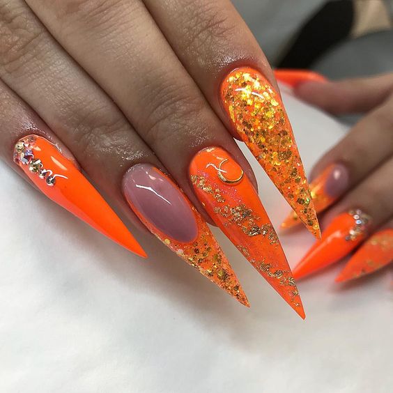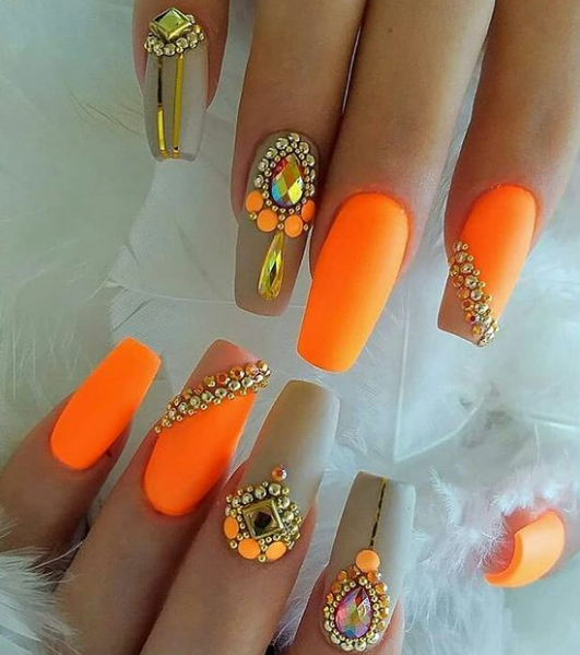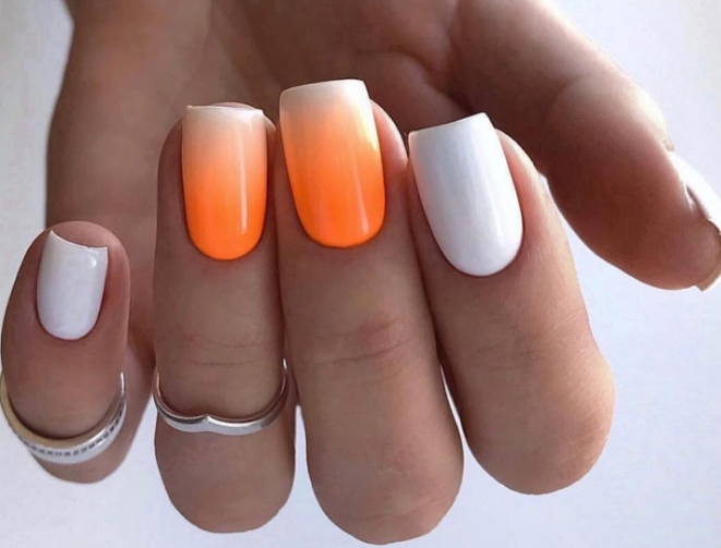 Длинные ногти “подружаться” с любым тоном палитры апельсинового. Особенно эффектно смотрится градиент из интенсивного морковного с переходом в естественный, прозрачный или молочный оттенок.