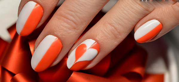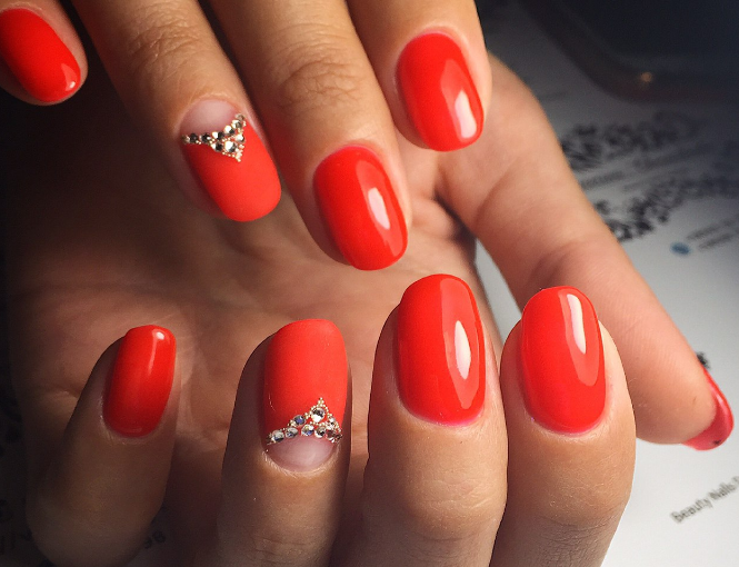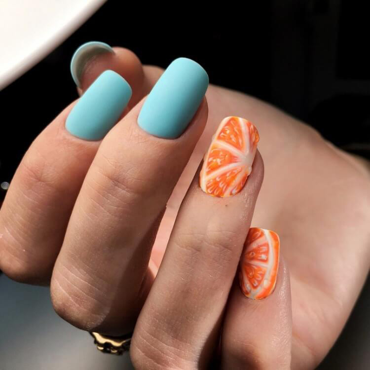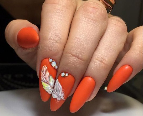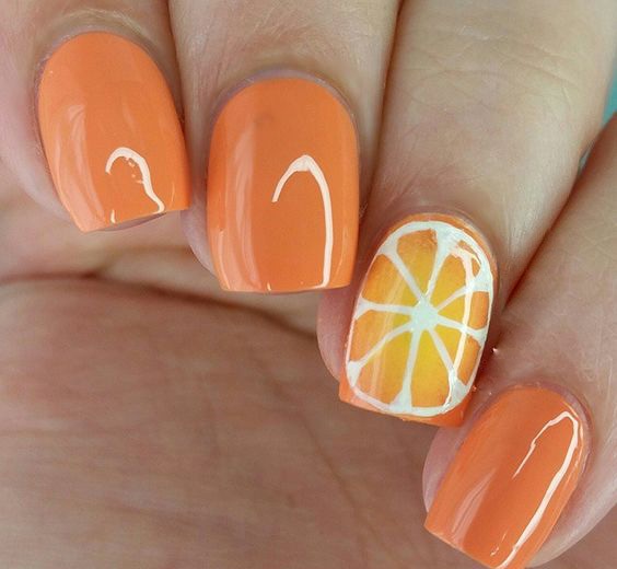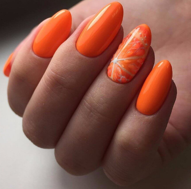 Сочный апельсин в дизайне ногтей. Сам по себе тот цвет очень активен и сделает ногти заметными. Чтобы приглушить дизайн, покрытие можно сделать матовым. Если не хочется интенсива, сделайте приглушенный дизайн — выделите ярким цветом один или два ногтя на руке.