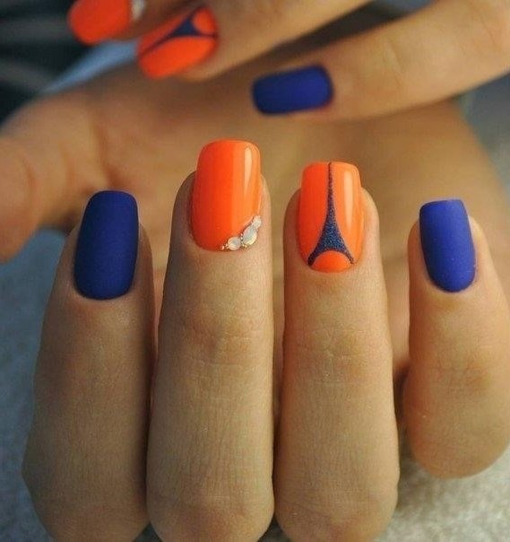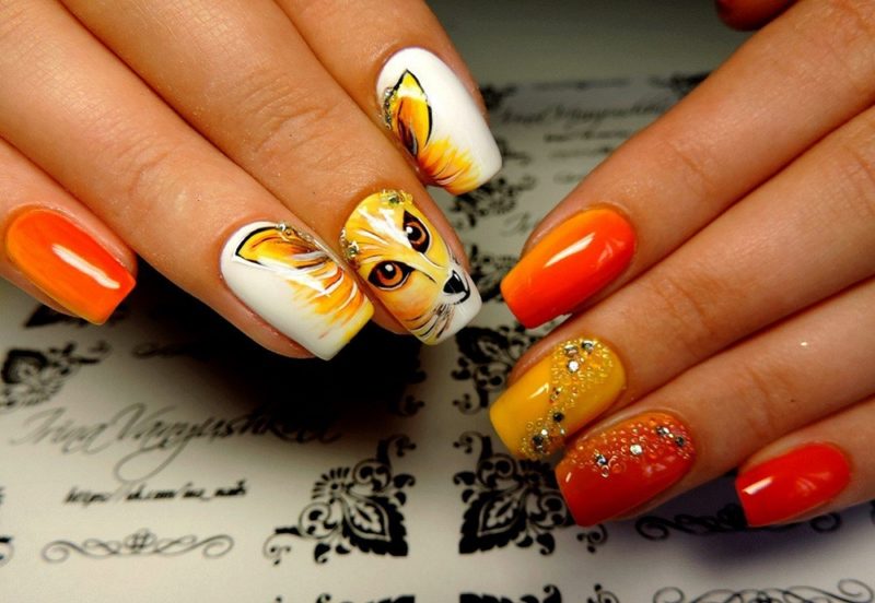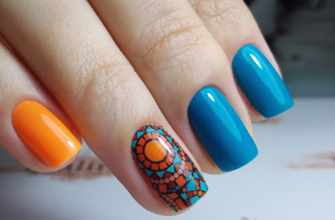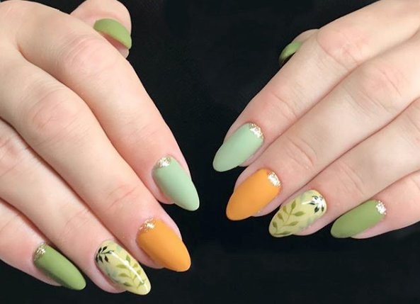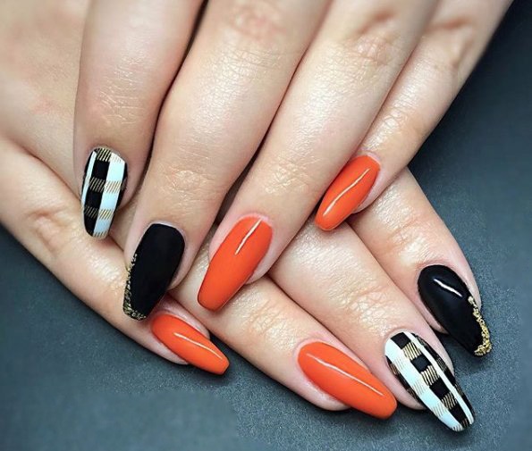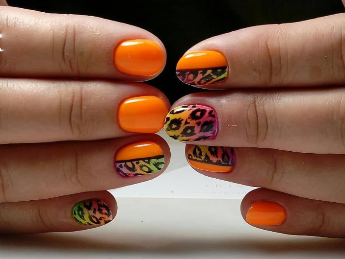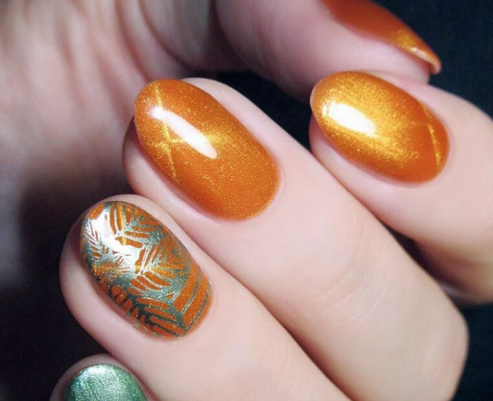 Многие помнят моду на разные по цвету шнурки или стильные ботинки и кеды. Нейл-арт не остался в стороне — дизайн “разные руки”позволяет воплотить самые смелые идеи. Вы можете оформить одну руку в оранжевых оттенках, вторую же в контрастных — черный и оранж, киноварь и зеленый. Или в качестве базы взять апельсиновый, а вот дизайн или рисунки для разных рук выбрать разные.