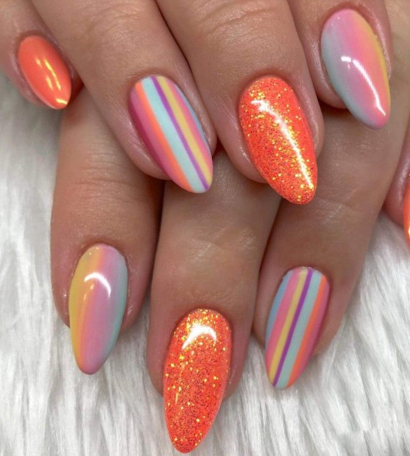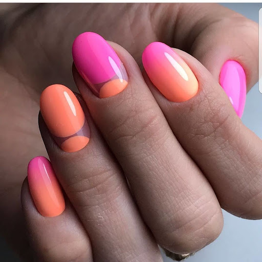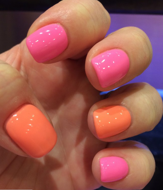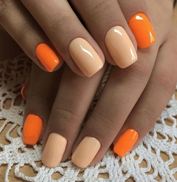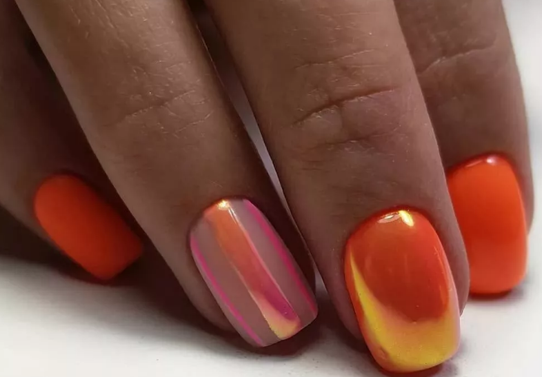 Нежный розовый в паре с оранжевым — хорошая идея для омбре, лунного дизайна ногтей, “вязаного” маникюра и “разных рук”.