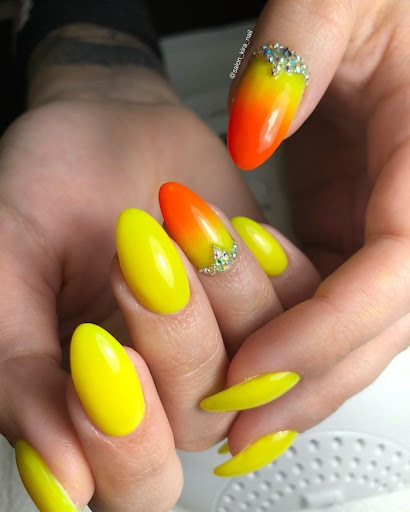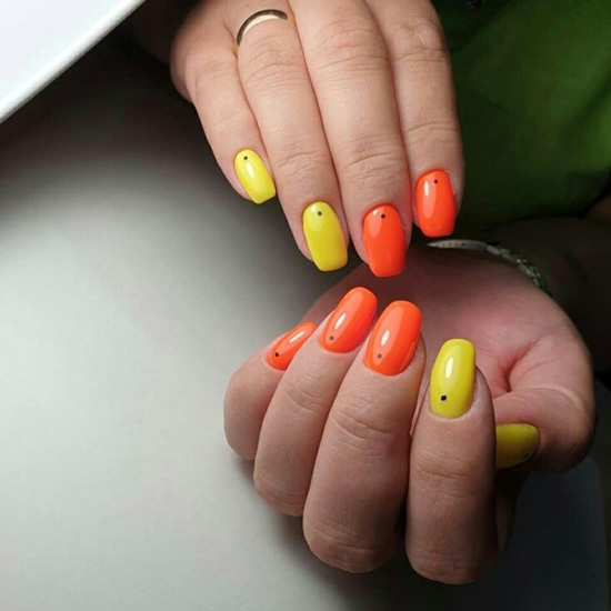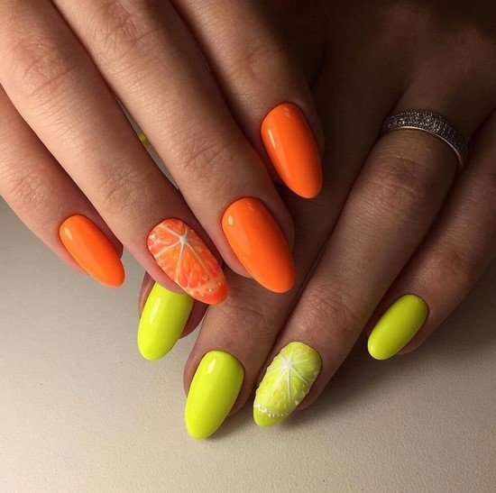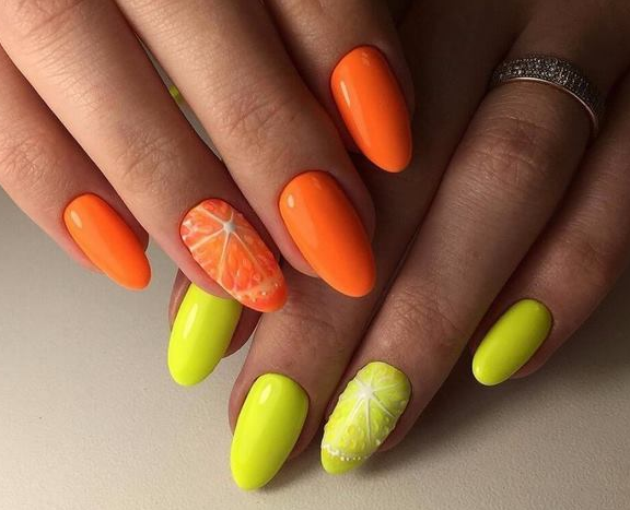 Два близких по тону цвета. основное правило сочетания в маникюре — один из пары должен быть более спокойным. С желтым можно создать сочное омбре, нарисовать дольки лимонов и апельсинов, сделать дизайн “разные руки”.