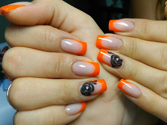 Необычный френч — признак тонкого вкуса. Вы можете выбрать прозрачную, молочную или бежевую базу. А кончик ногтя выделить абрикосовым или апельсиновым. Основной фон можно дополнить нежными узорами — черным, золотым или белым.
