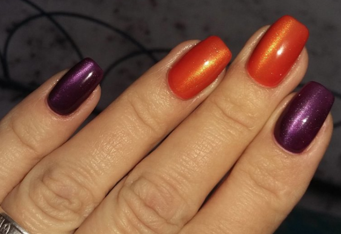 Сложная пара, с помощью которой можно создать сочный яркий вариант маникюра. Такой тандем подойдет для “разных рук”, выделения одного ногтя, “кошачьего глаза”, рисунков.