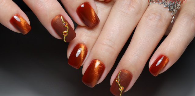 Кошачий глаз отлично смотрится на оттенках киноварь, медный, горчичный и других осенних.