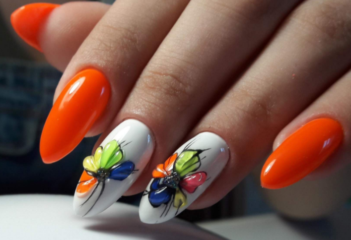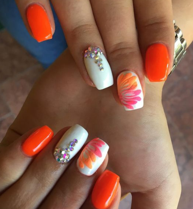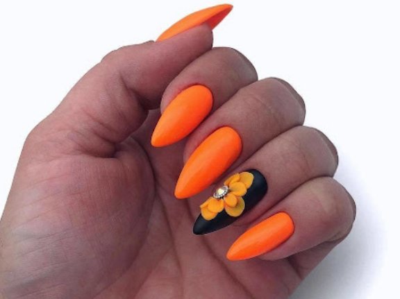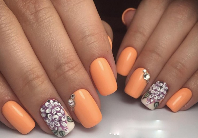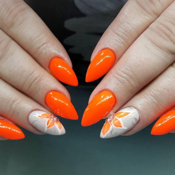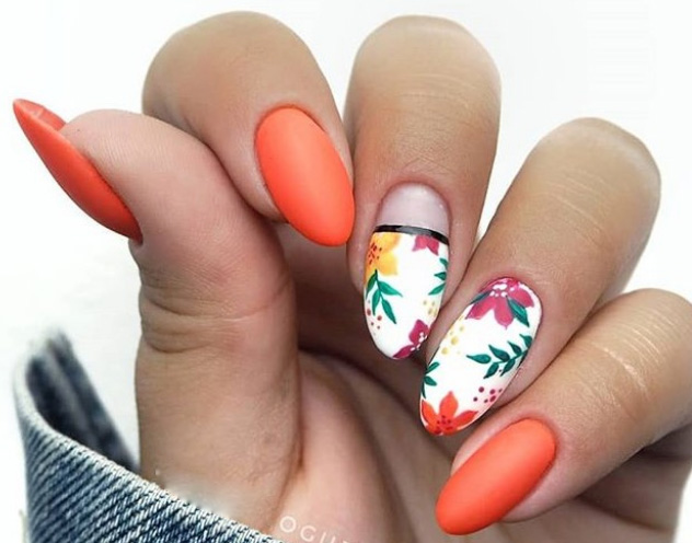 Цветы на ногтях — беспроигрышный вариант, когда нужно создать нежный, но в то же время свежий и дерзкий образ. Не стоит искать в природе цветы апельсинового оттенка, вы можете придумать их самостоятельно.