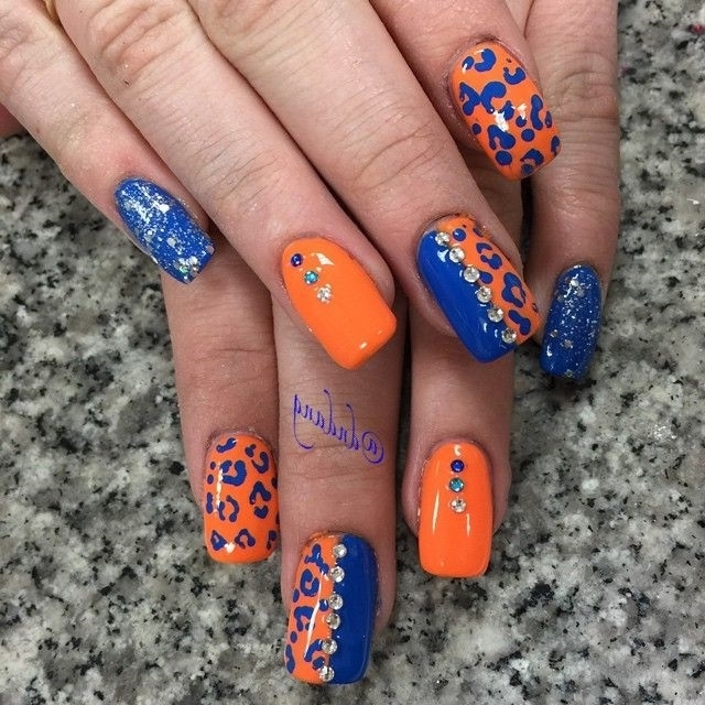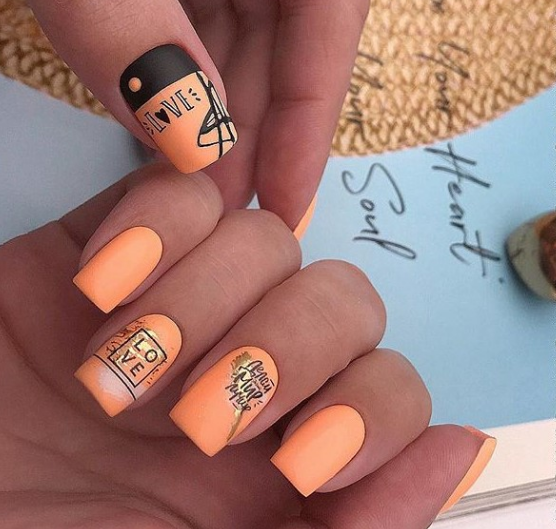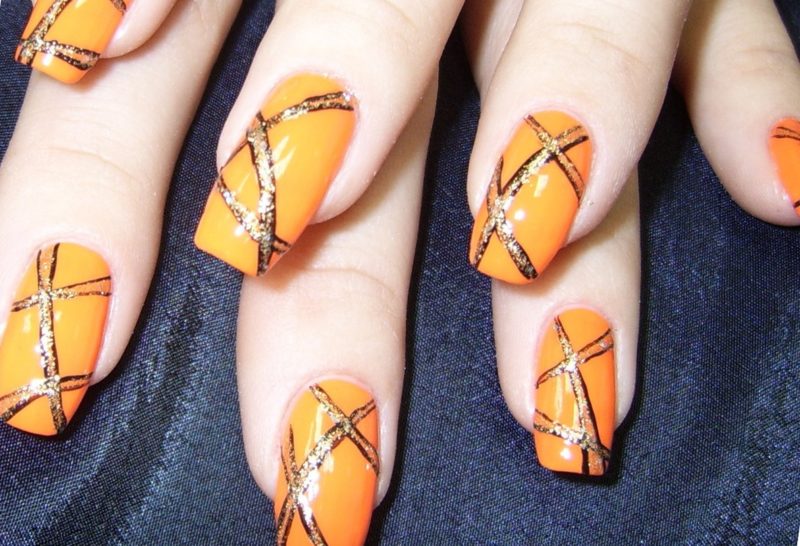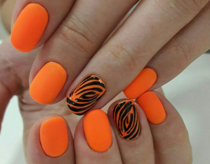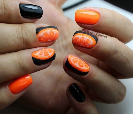 Оранжевый — отличный фон для контрастных рисунков. Другой вариант — нанесение апельсинового рисунка на нейтральную или контрастную базу. Оба варианта позволяют сделать эффектный стильный дизайн. Если планируете делать маникюр дома, придется потренироваться. При недостатке таланта художника на выручку придут наклейки, трафареты, фольгированные клеевые полоски.