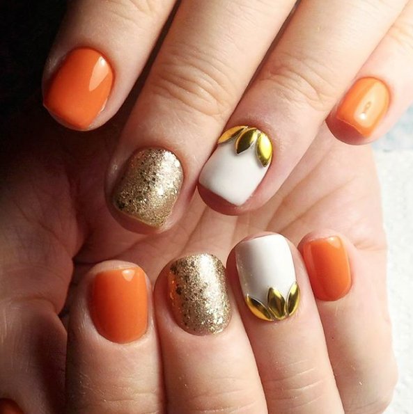 Оранжевый и золото — прекрасный тандем. Золотые узоры или выделение одного ногтя золотом — вариант для осеннего или зимнего дизайна, когда хочется добавить цвета в серые будни.