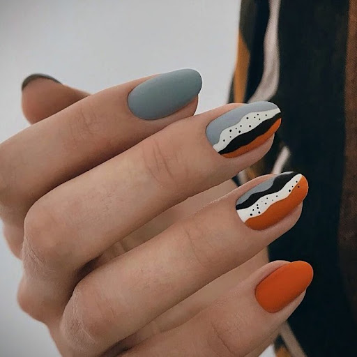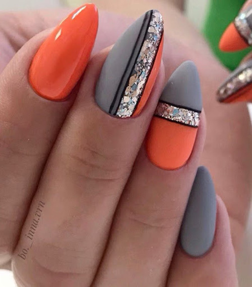 Серый — оттенок, которому под силу обуздать даже неоновый оранжевый. Добавьте в пару к апельсину матовый серый и ваш маникюр не вызовет вопросов даже при строгом дресс-коде.