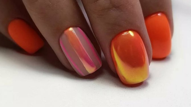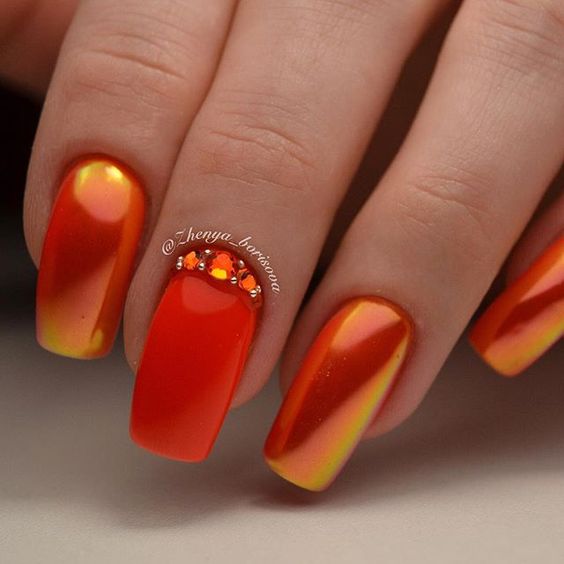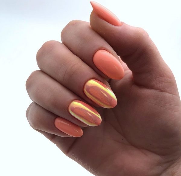 Зеркальная втирка — отличный вариант для того, чтобы сделать красивый акцент в ярком маникюре. Выбирайте оттенок втирки, близкий к основному тону. Советуем выделить всего один (или два) пальчика на руке. Этого достаточно для такого интенсивного цвета, как оранжевый.