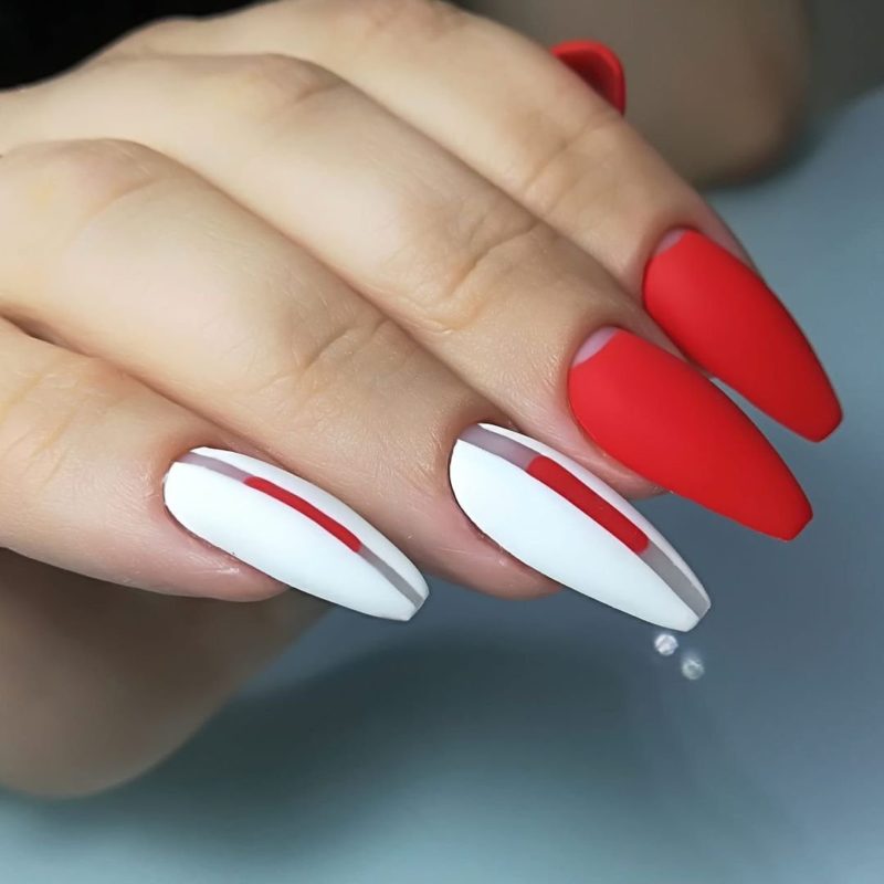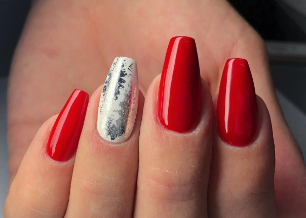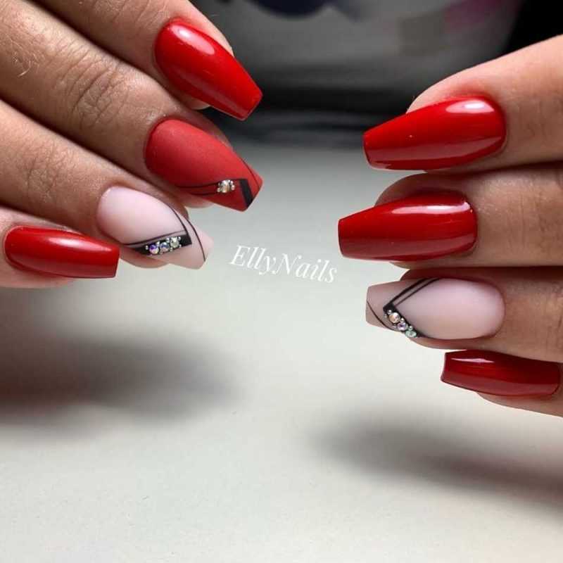 Яркий страстный красный оттенок — вариант маникюра для смелых и активных. Такие ноготки с формой балерина обязательно привлекут всеобщее внимание. С дизайном стоит быть аккуратнее. Интенсивный оттенок самодостаточен и лишний блеск, стразы могут сделать маникюр безвкусным. А вот рисунки в стиле минимализм только добавят шарма.