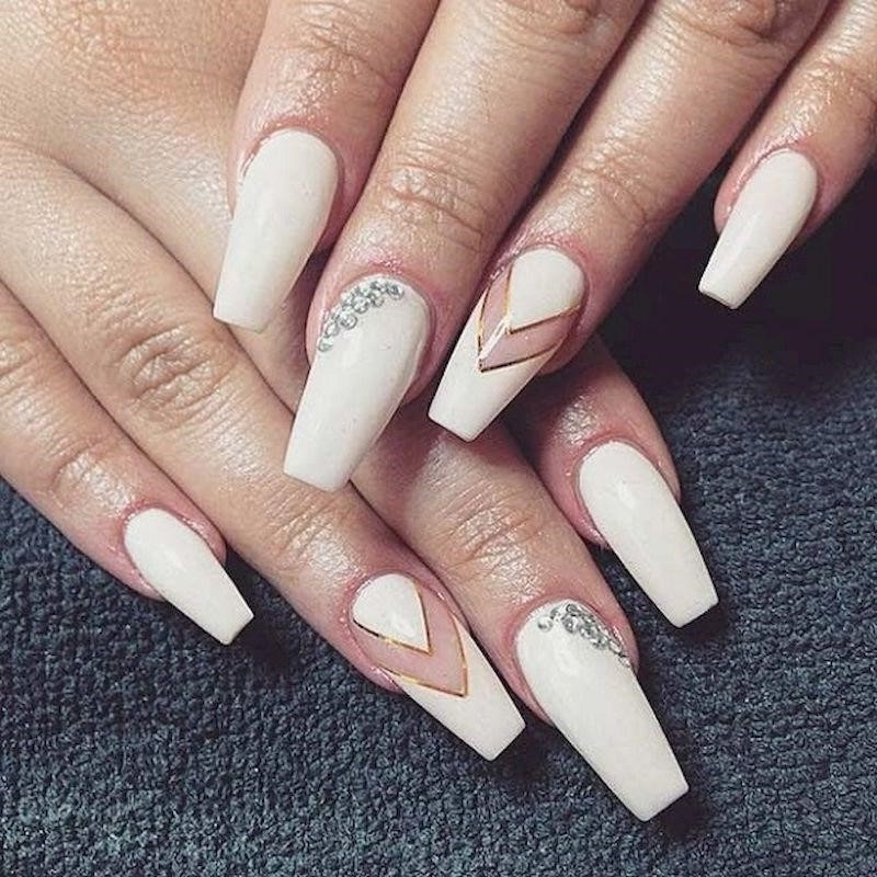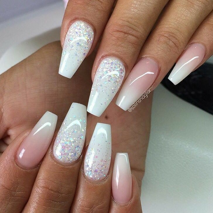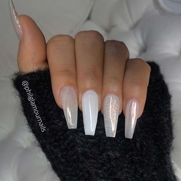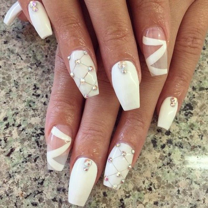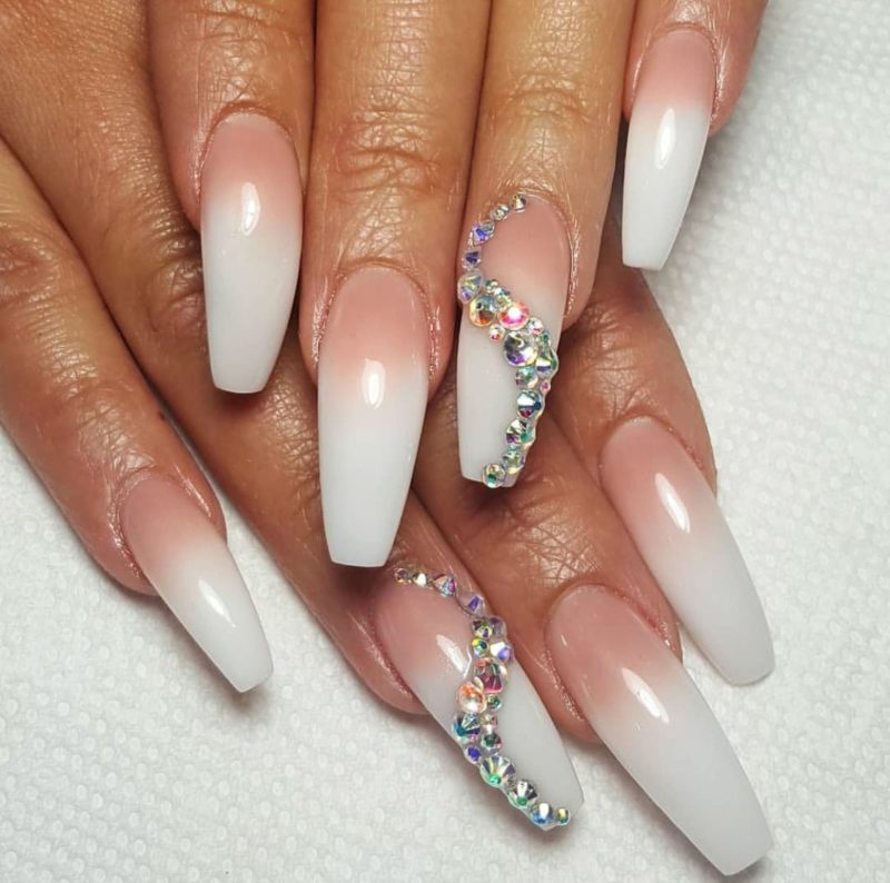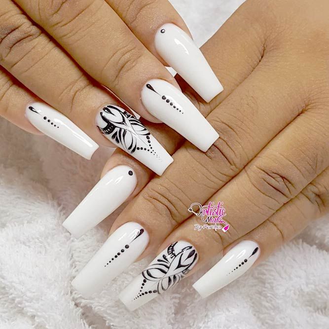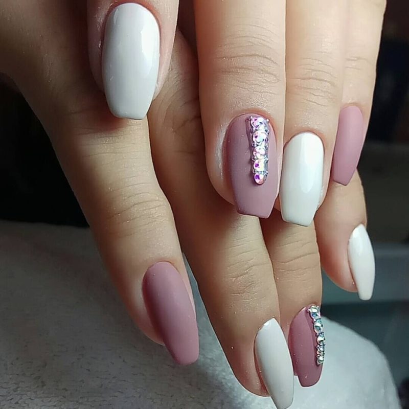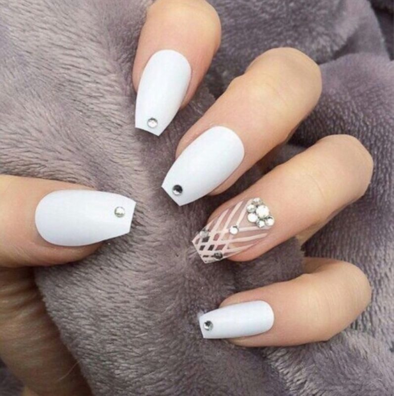 Белый — от плотного до полупрозрачного камуфляжа — идеальный вариант для маникюра с балериной. Кроме того, это прекрасная база для дополнительного дизайна — страз, блесток и рисунков. На белом фоне можно разместить декор стемпингом, надписи, геометрию или анималистичный принт.