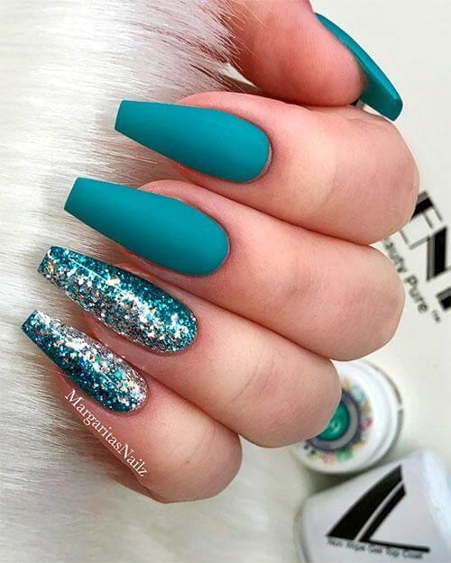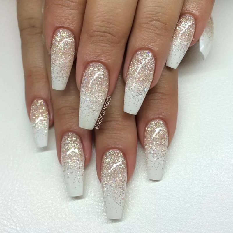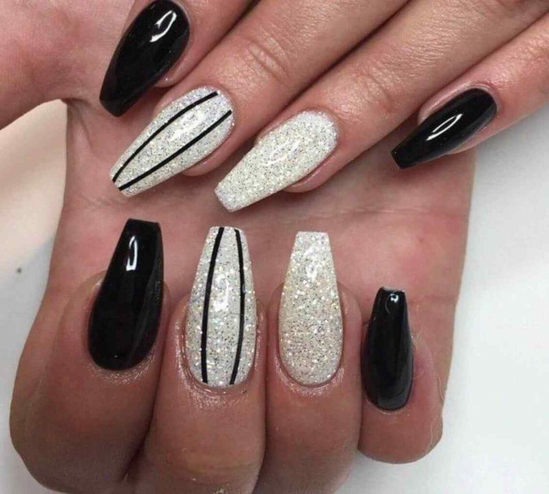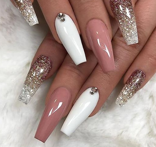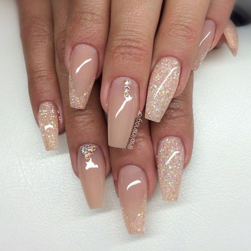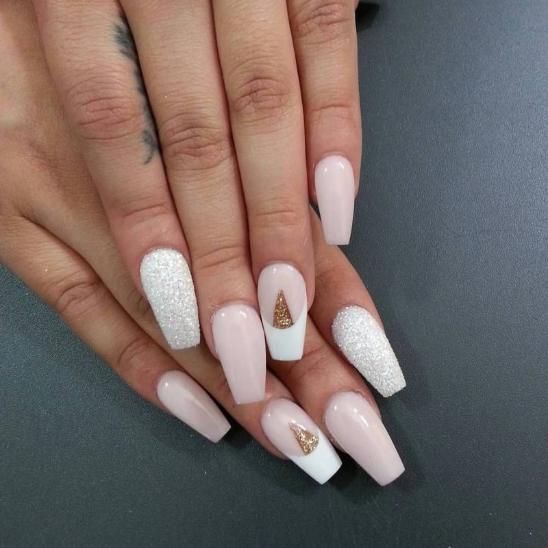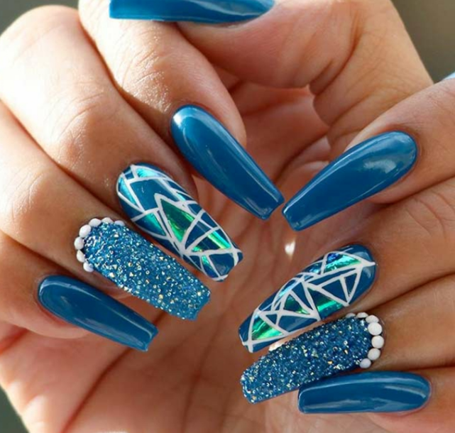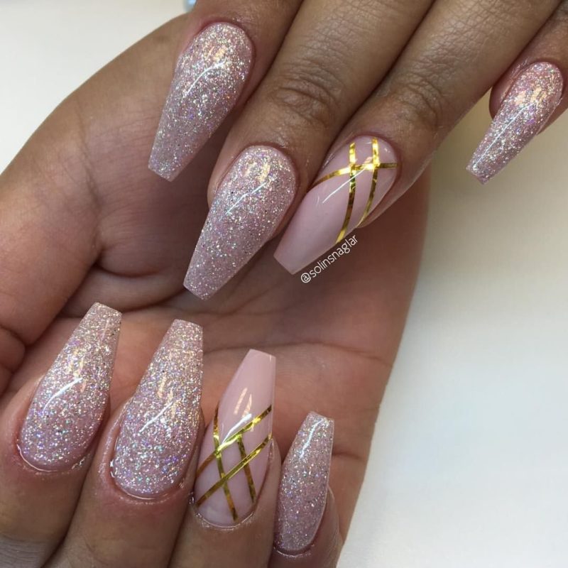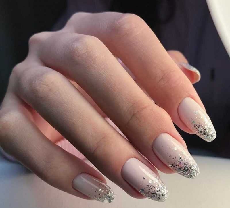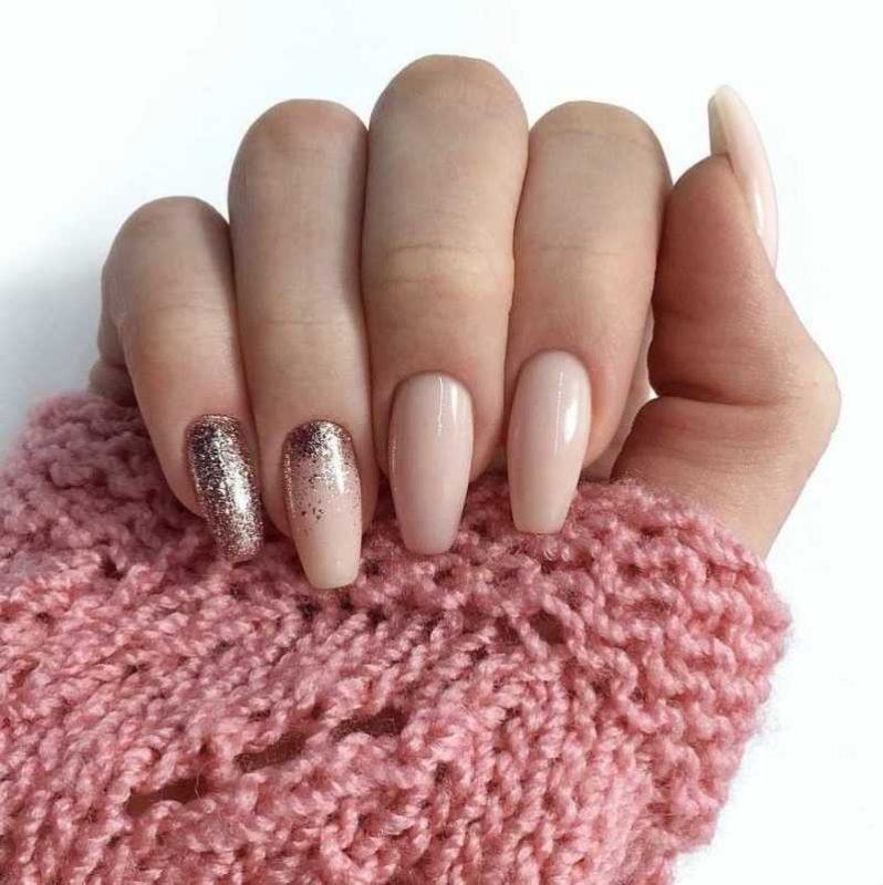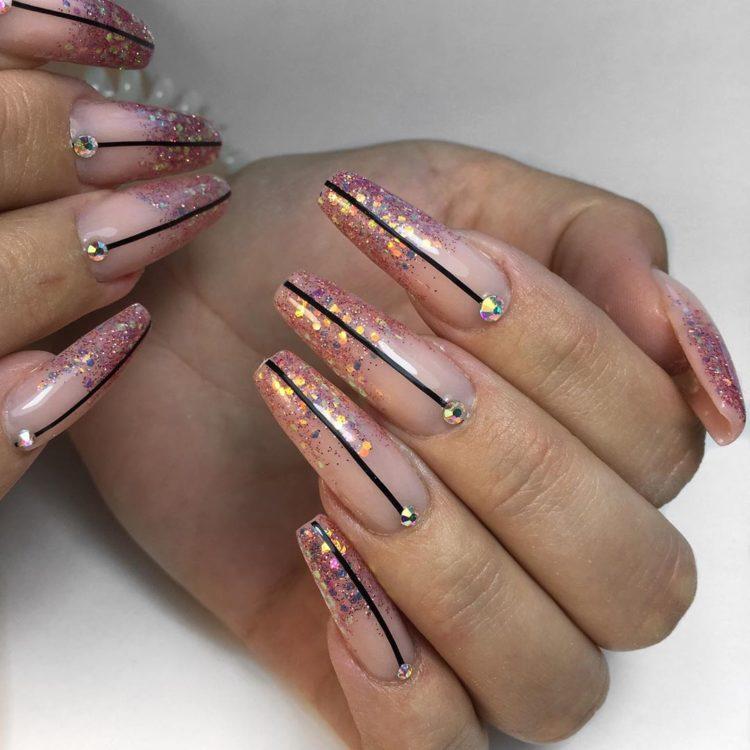 Форма пуанты самодостаточна и ее очень просто испортить, если переборщить с дизайном. Именно блестки могут «убить» эффект изысканности и стиля. Чтобы не сделать маникюр чрезмерным, выберите определенную зон для декорирования — кайму, лунку, линии рисунка и др. Достаточно простого блестящего акцента, чтобы придать особого шарма маникюру.