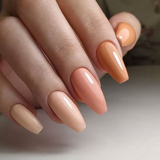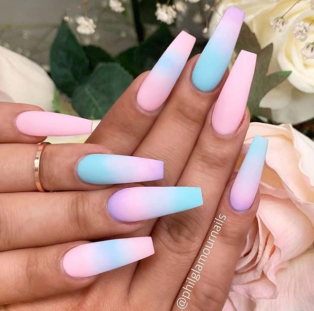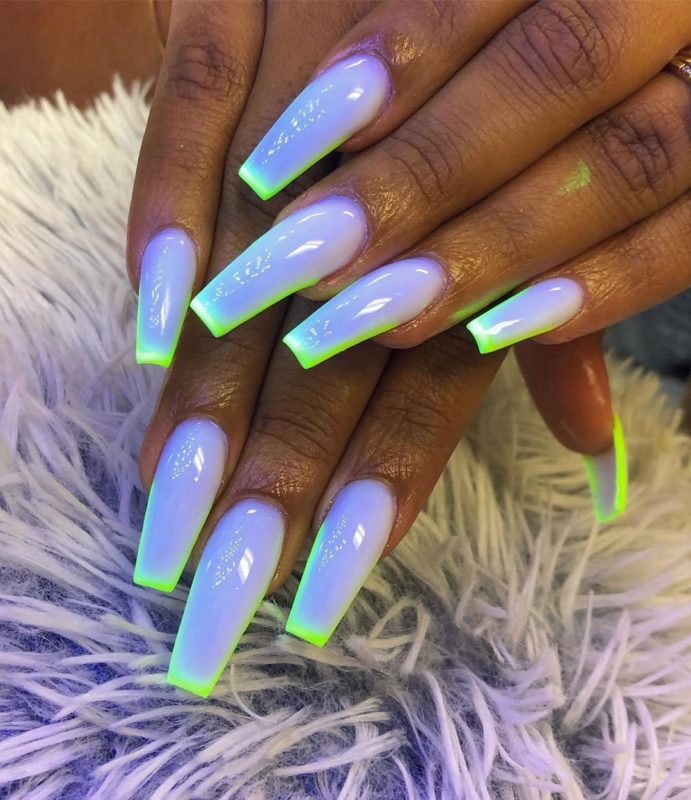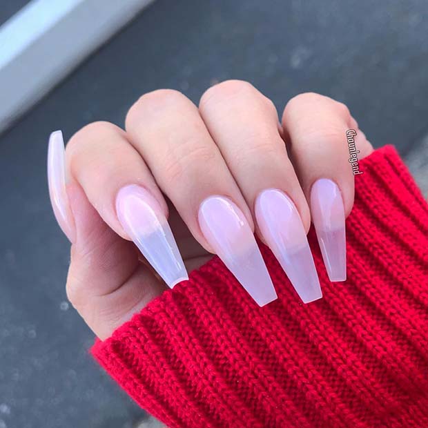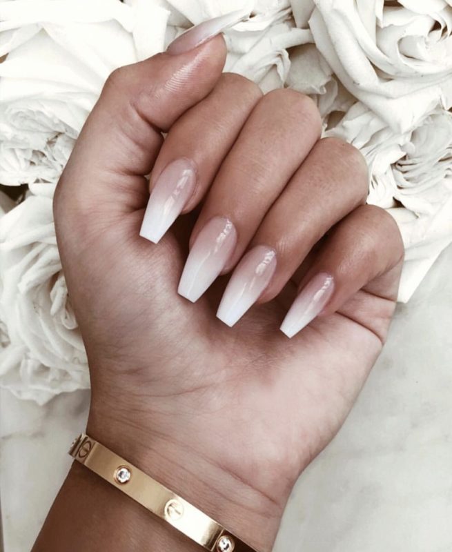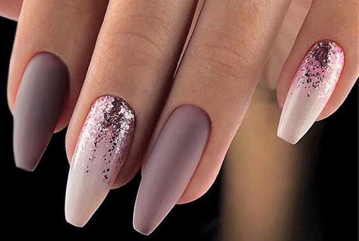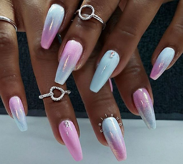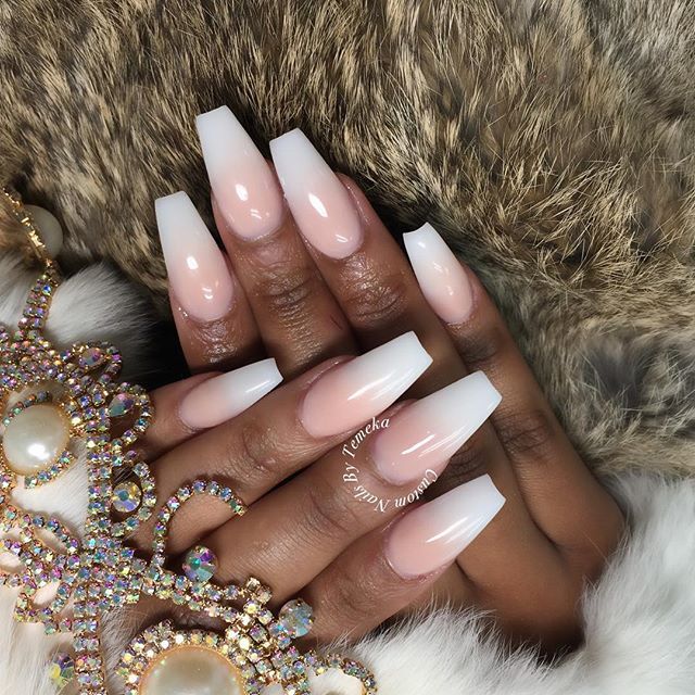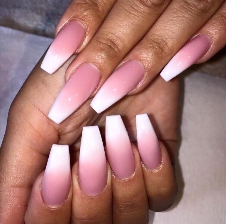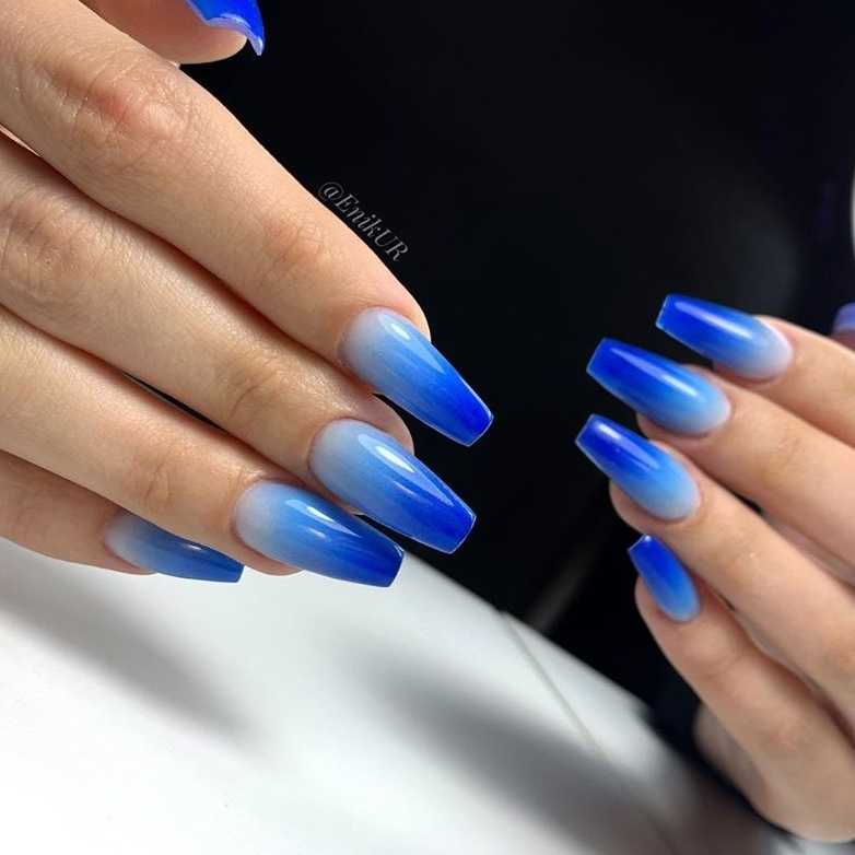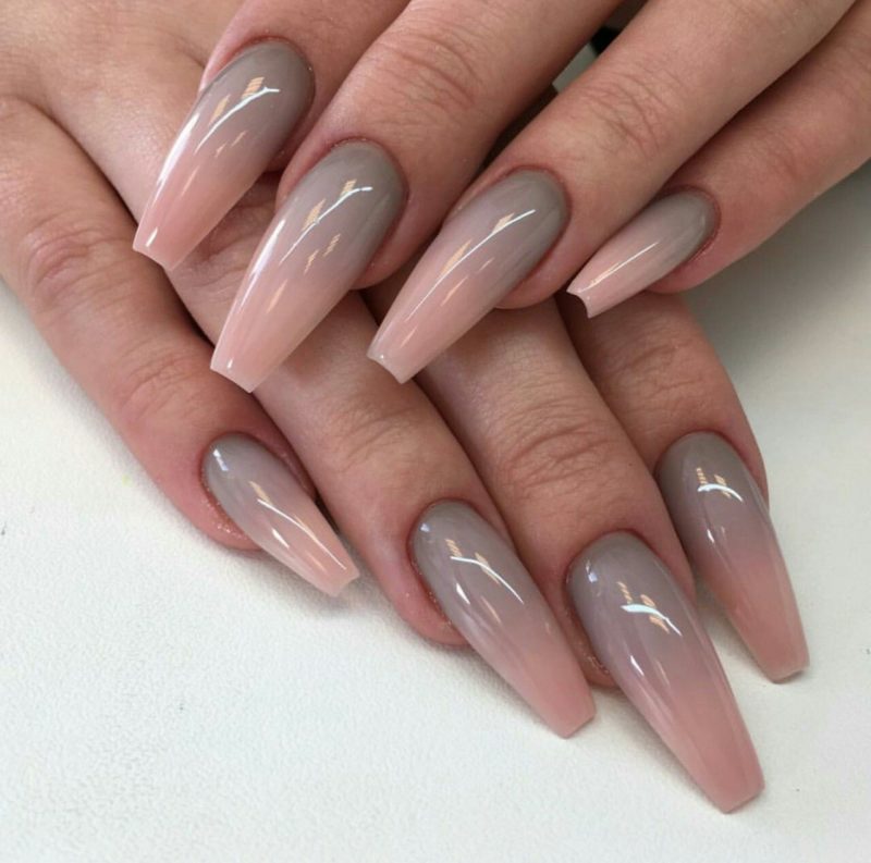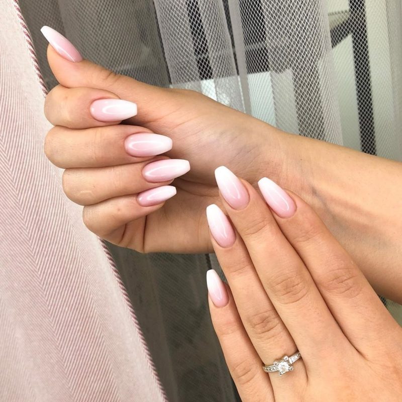 Длина балерины позволяет поиграть с растягивание цветов. Вы можете выбрать близкие в палитре цвета или сделать яркое контрастное омбре с растяжкой от темного к максимально светлому (или наоборот). От выбранной задачи будет зависеть сложность работы. Омбре из близких оттенков можно сделать дома самостоятельно с помощью мелкопористого спонжа.