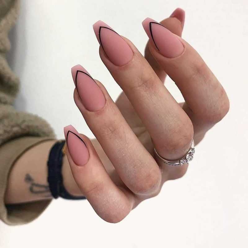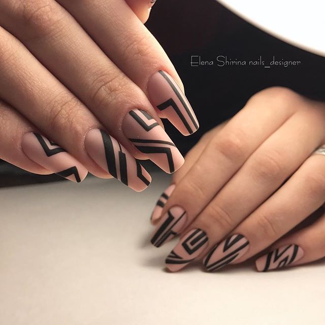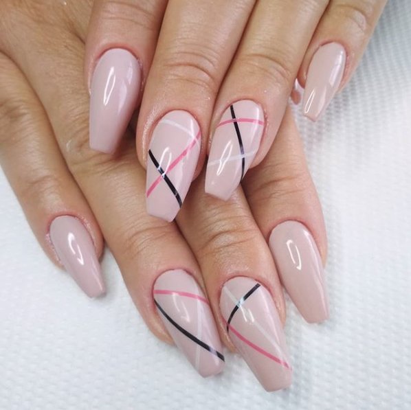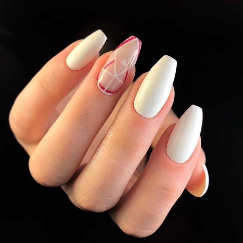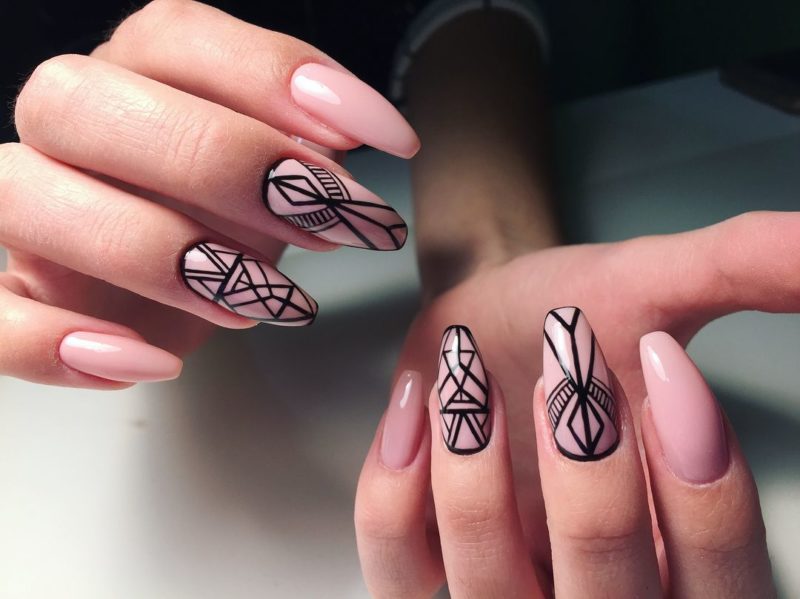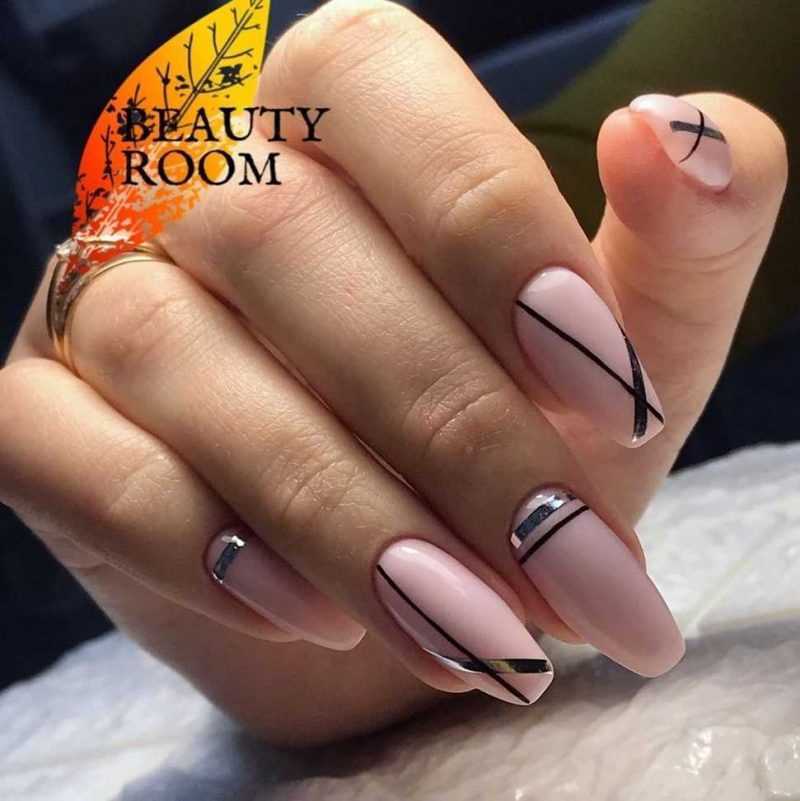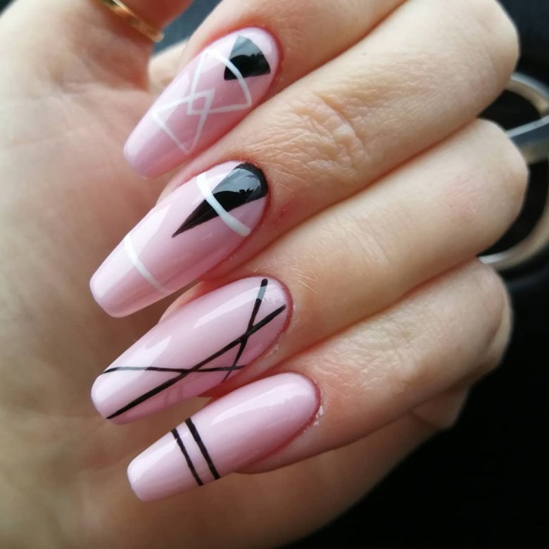 Маникюр балерина отлично смотрится с рисунками. Для такого дизайна лучше выбирать стиль минимализм — абстракция, геометрия. Четкие линии помогут скорректировать неудачный опил — вытянуть пропорции и сделать так, чтобы маникюр смотрелся адекватно. Линии рисунка лучше располагать вертикально или диагонально, повторяя уголки опила маникюра.