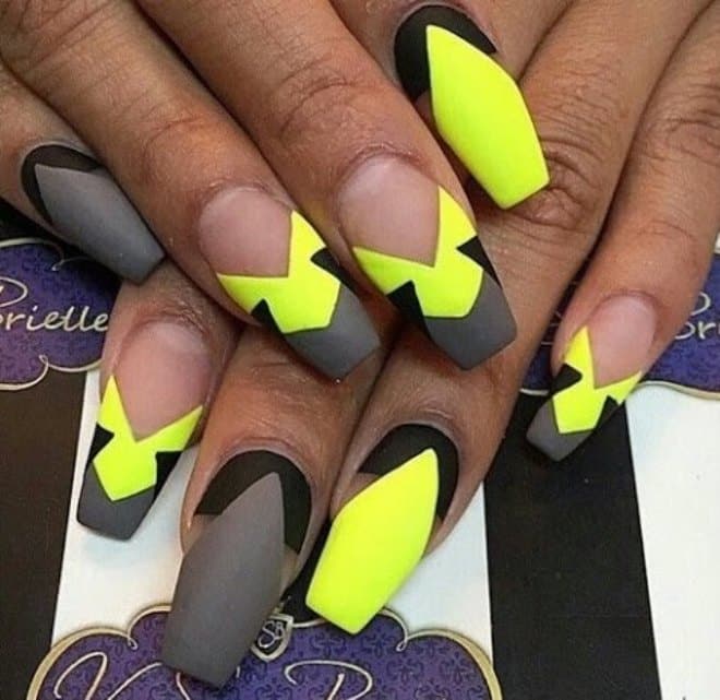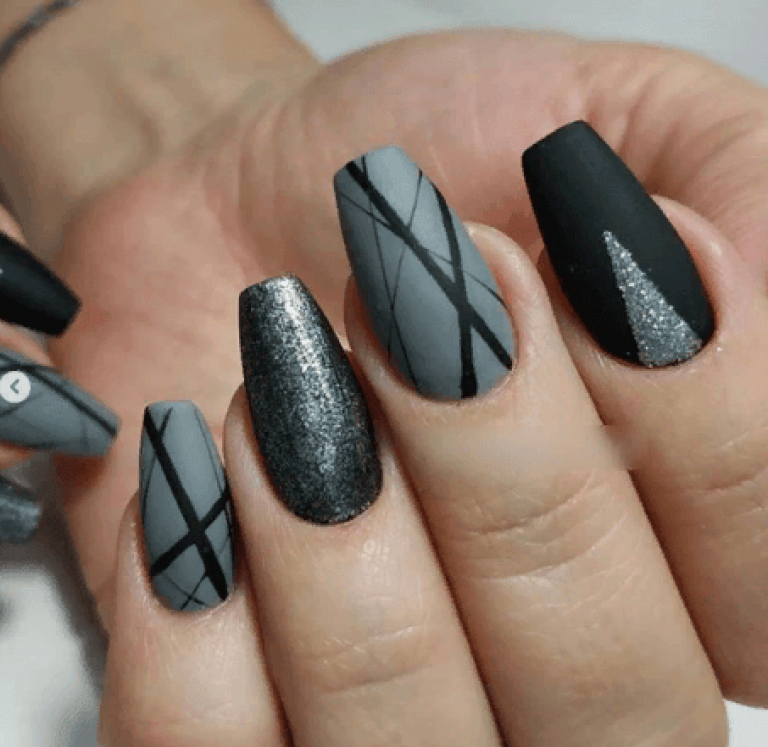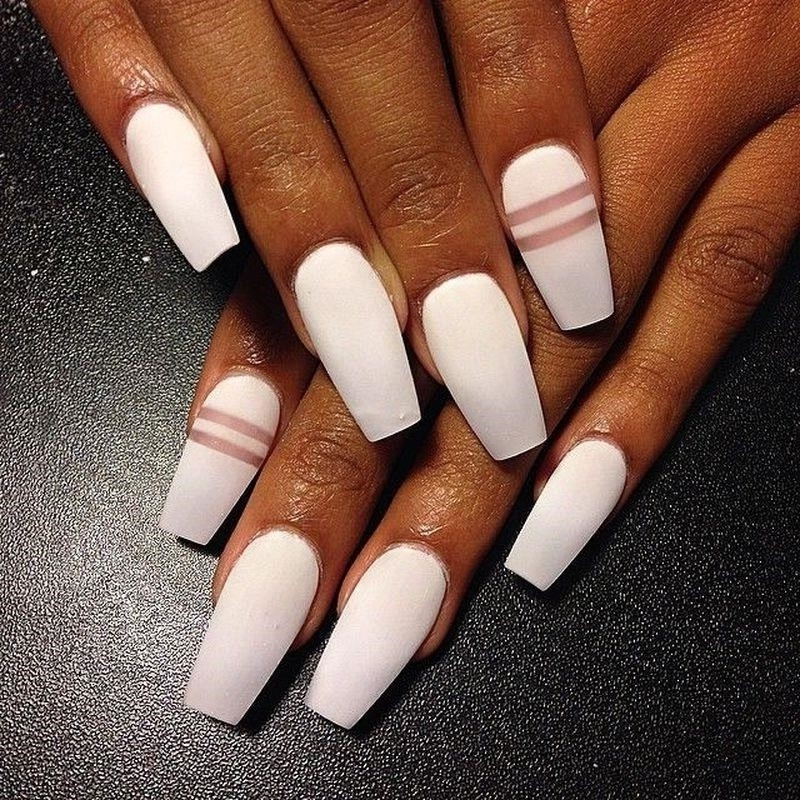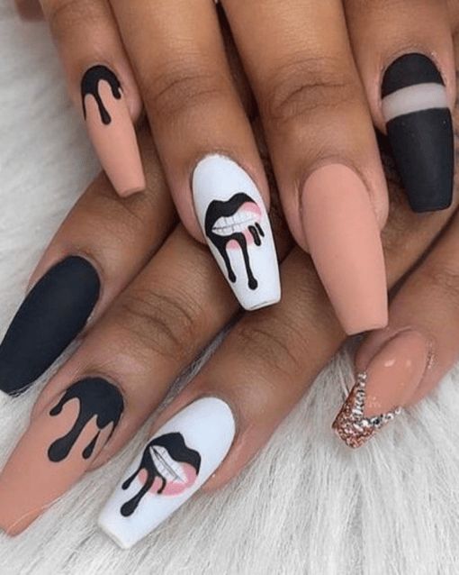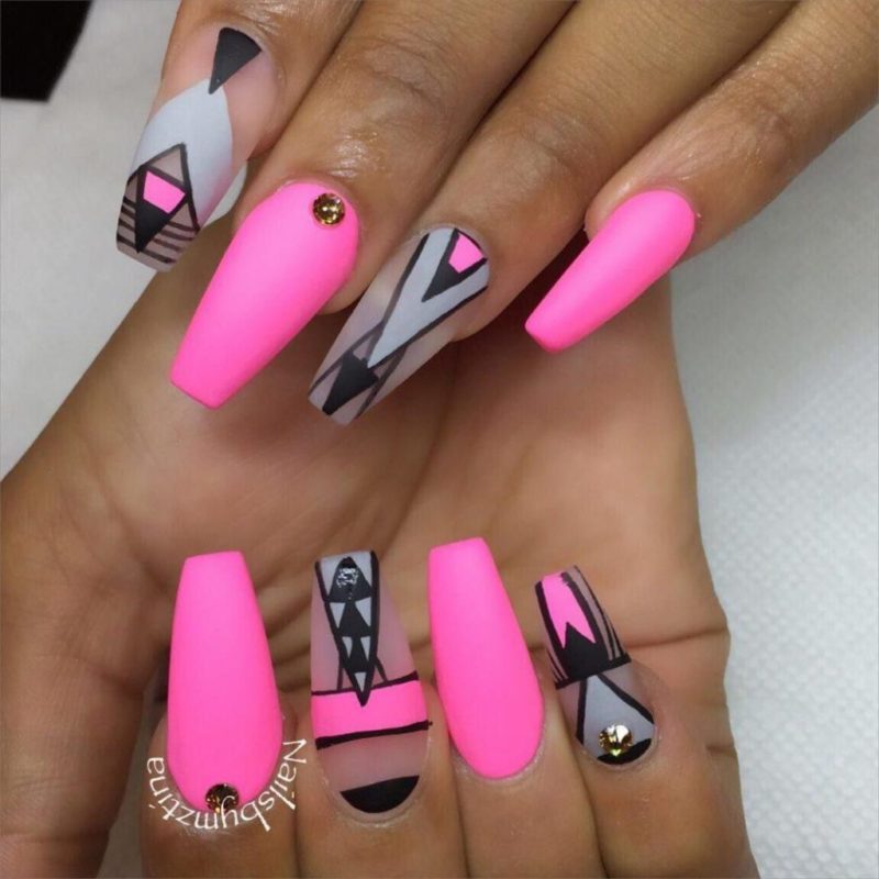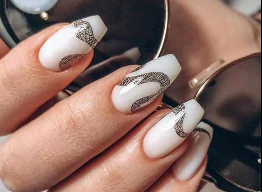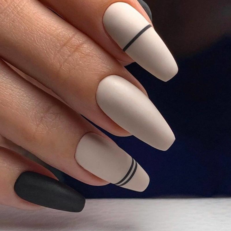 Маникюр балерина отлично смотрится с рисунками. Для такого дизайна лучше выбирать стиль минимализм — абстракция, геометрия. Четкие линии помогут скорректировать неудачный опил — вытянуть пропорции и сделать так, чтобы маникюр смотрелся адекватно. Линии рисунка лучше располагать вертикально или диагонально, повторяя уголки опила маникюра.