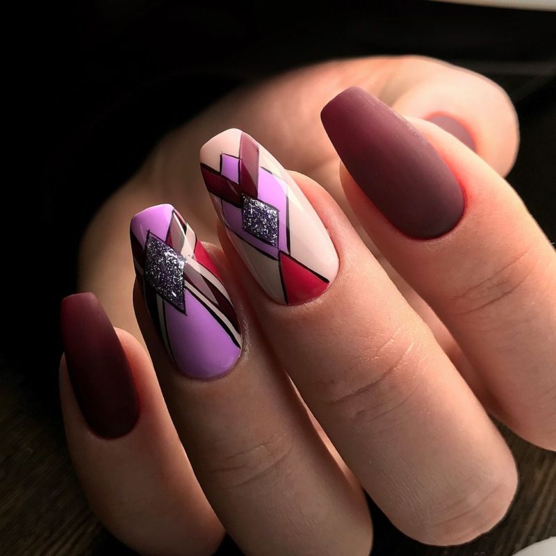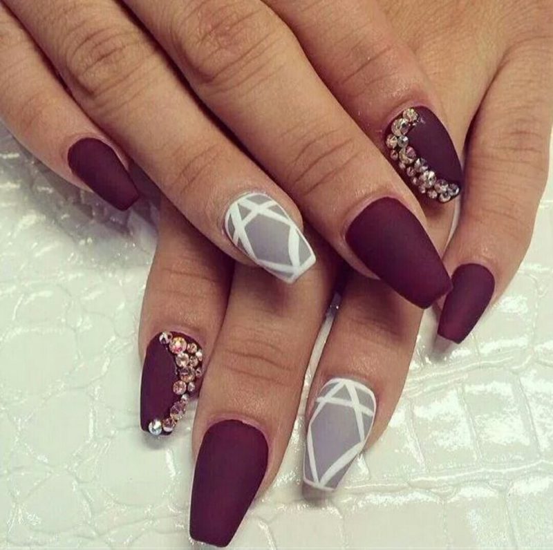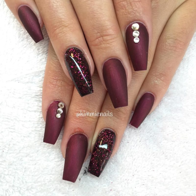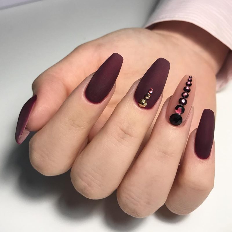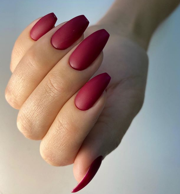 Если хотите необычного дизайна, выбирайте матовую вишневую текстуре. Такой маникюр выглядит ухоженно и дорого.