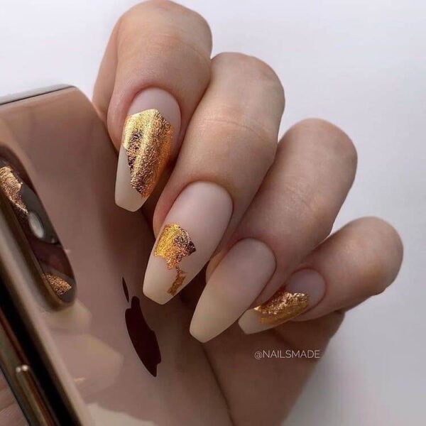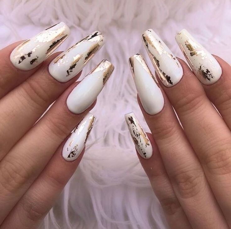 Фольга смотрится эффектно, но более благородно, чем втирка. Можно использовать отрывную фольгу или поталь — листочки тончайшего металла. Последний может продаваться в виде хлопьев, которые не сложно наносить самостоятельно. Выделяйте отдельные зоны, улыбку френча, лунки или дополняйте фольгой дизайн мрамор.