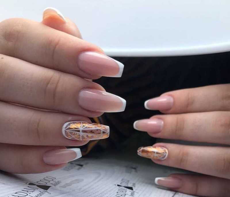 Френч — это один из самых подходящих видов дизайна для формы балерина. Лучше выбирать классическое сочетание цветов, привычную линию улыбки. Если хотите чего-то необычного, выбирайте дизайн френча в стиле шеврон. Треугольная улыбка в сочетании с необычной формой пластины будут смотреться стильно и модно.