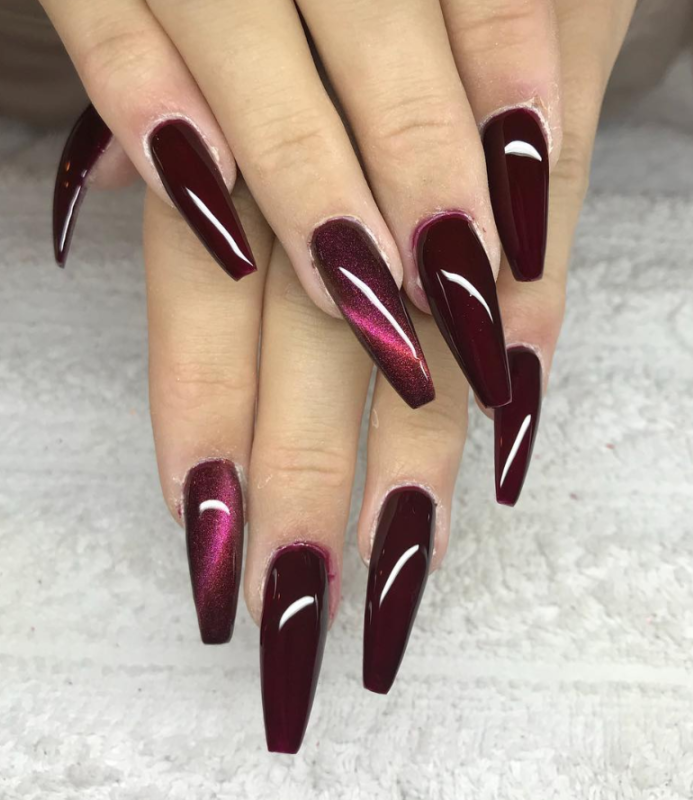 Вся палитра бордового эффектно смотрится на ногтях балерина. но маникюр с вишневым лаком выбивается из общей картины. Глубокий насыщенный оттенок вишни делает дизайн смелым и сочным. Маникюр без излишеств подходит к любому образу — от офисного до торжественного.