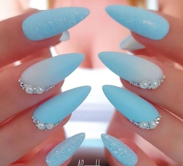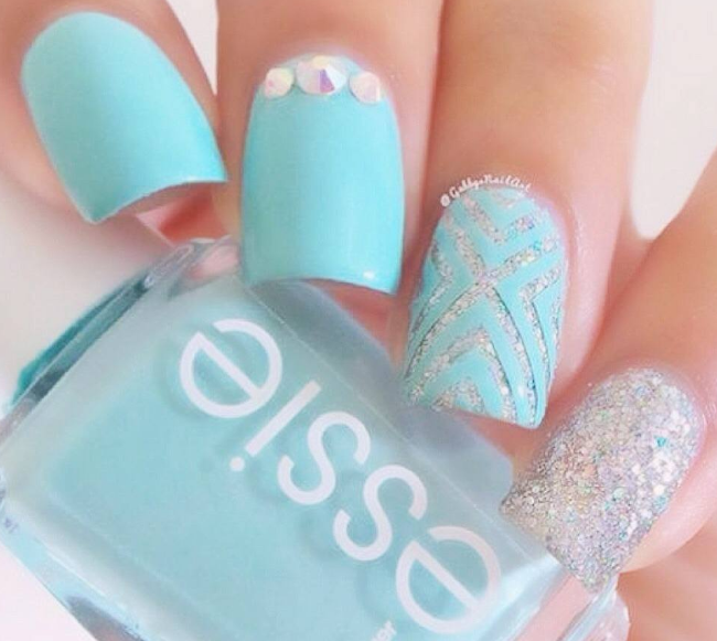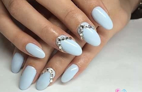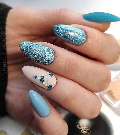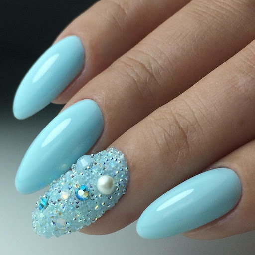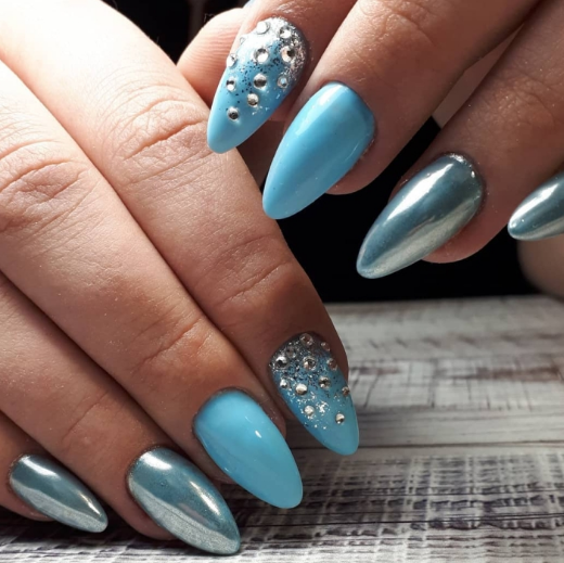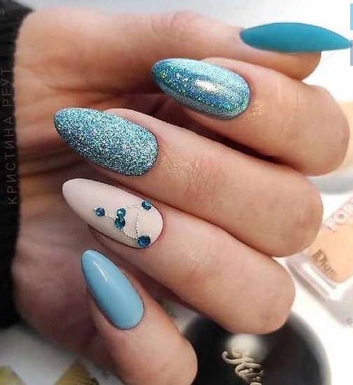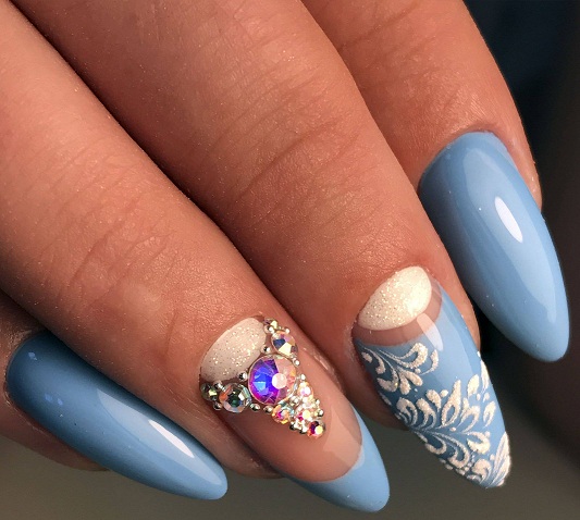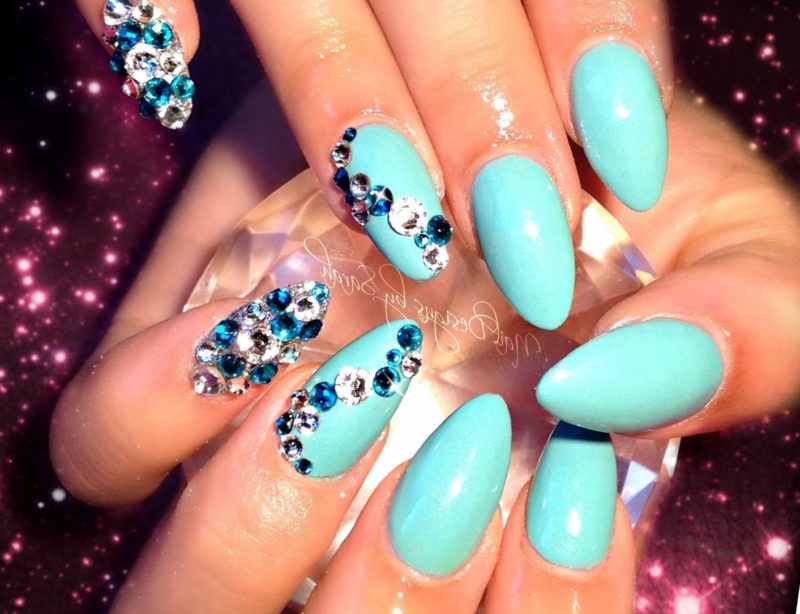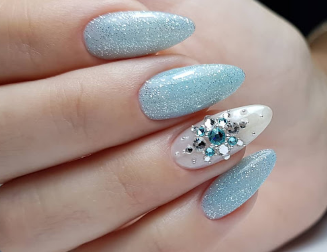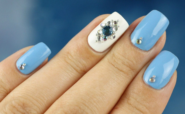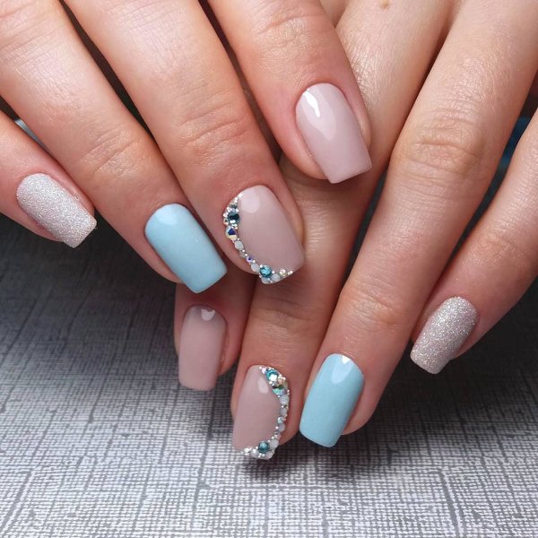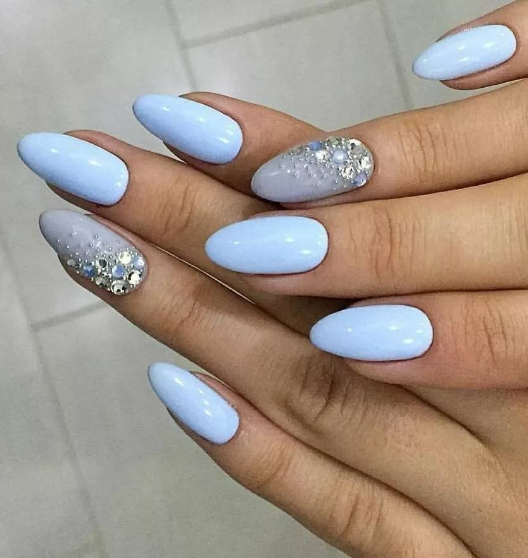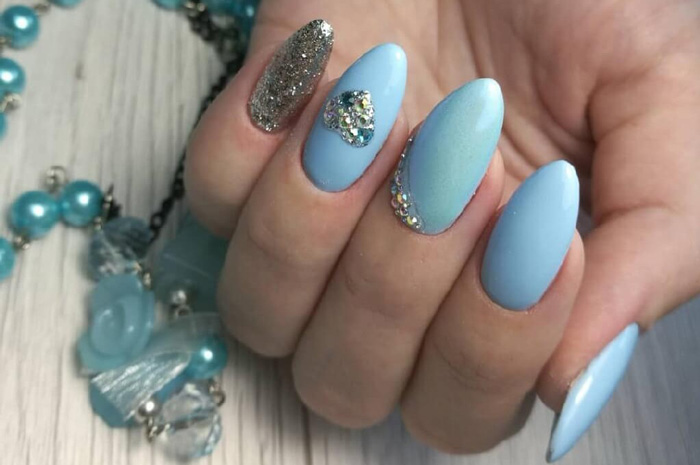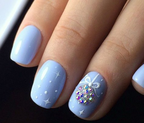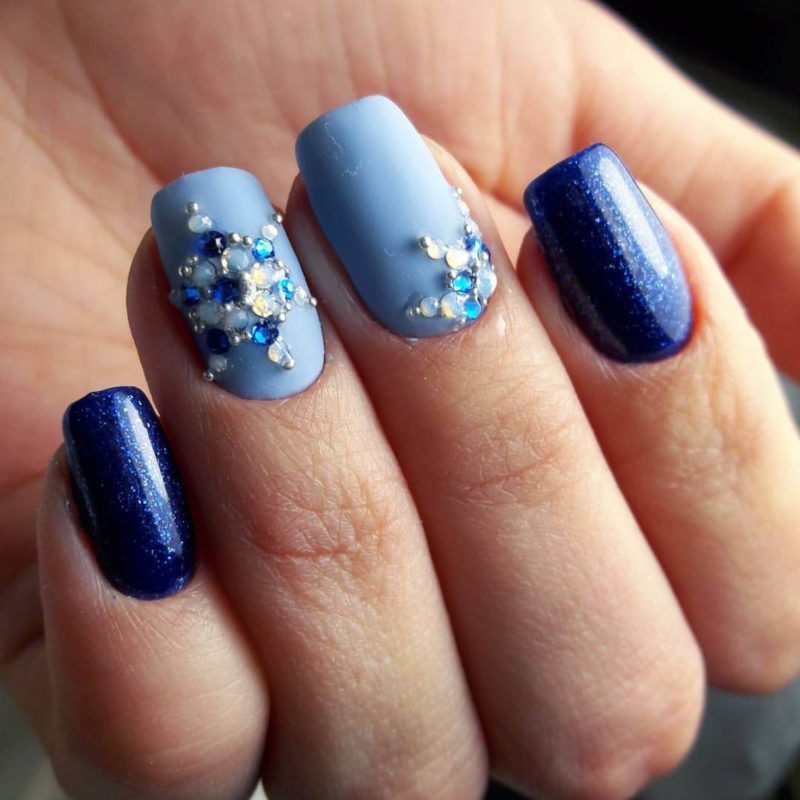 Сочетание базы голубого цвета и серебристых стразов — идеальный дизайн маникюра для ледяной принцессы. Россыпь камней разного оттенка сделает маникюр шикарным, праздничным.