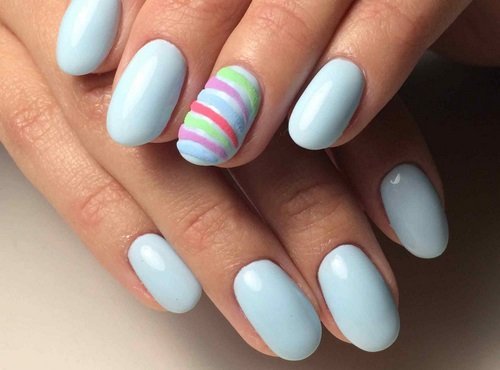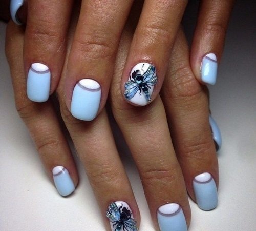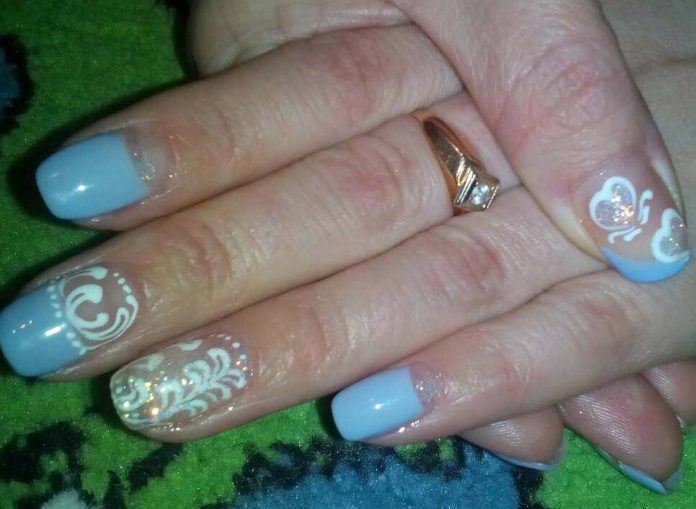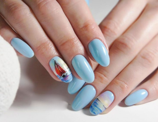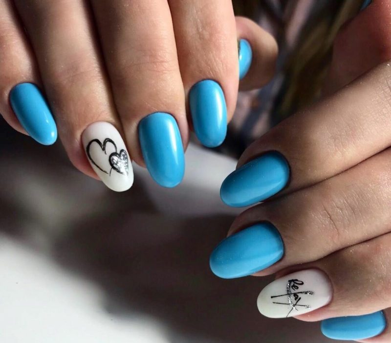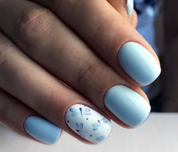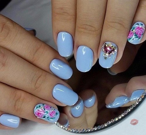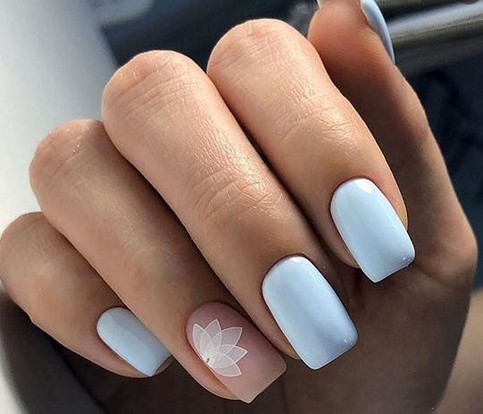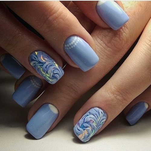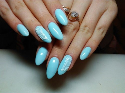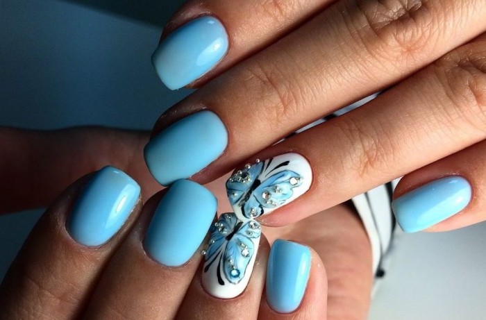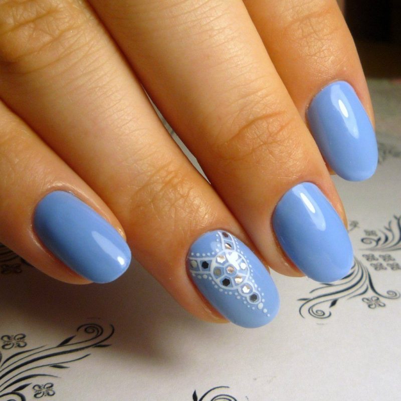 По длине ногтей голубой тоже не имеет никаких ограничений. Для обладательниц коротких ноготков этот оттенок станет выходом — маникюр в небесных тонах сделает руки изящными. Дизайн на таком фоне смотрится особенно эффектно. Здесь действует только одно правило — уместность и сдержанность.