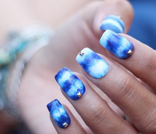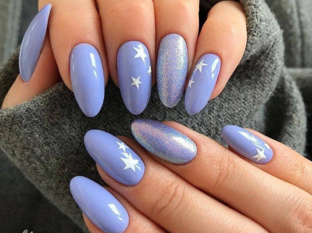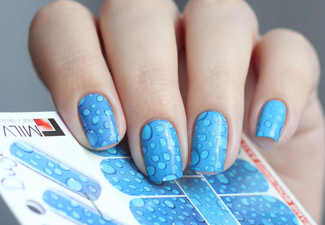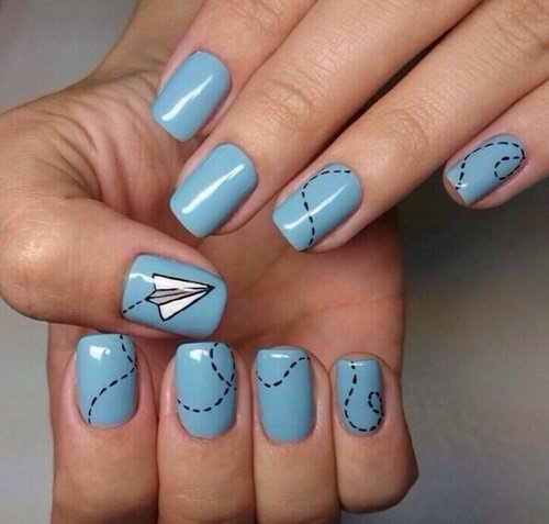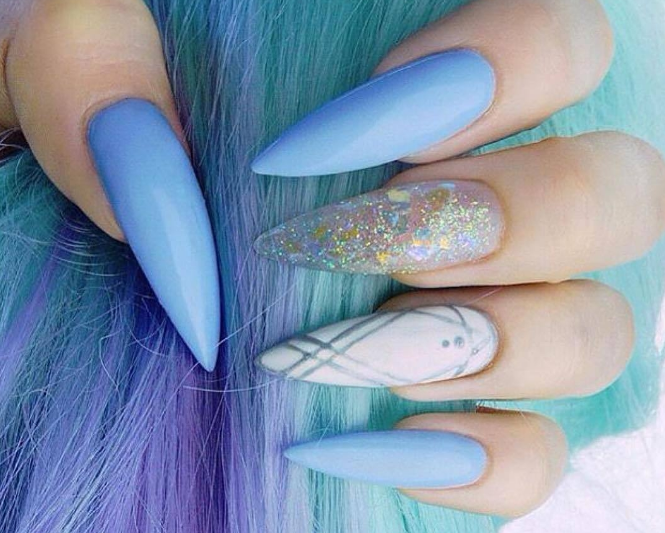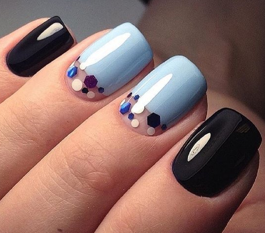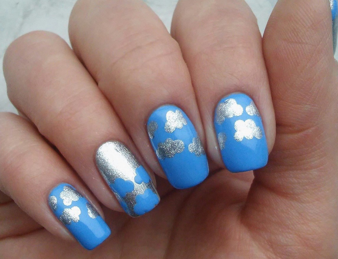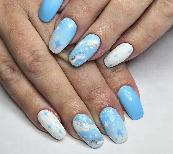 А вот на длинных ногтях модницы могут позволить разгуляться фантазии — небесный маникюр подружится с любым дизайном. Отлично смотрятся рисунки (наклейки, стемпинг или авторская работа), полоски, втирки, фольгированные элементы, френч, лунки.